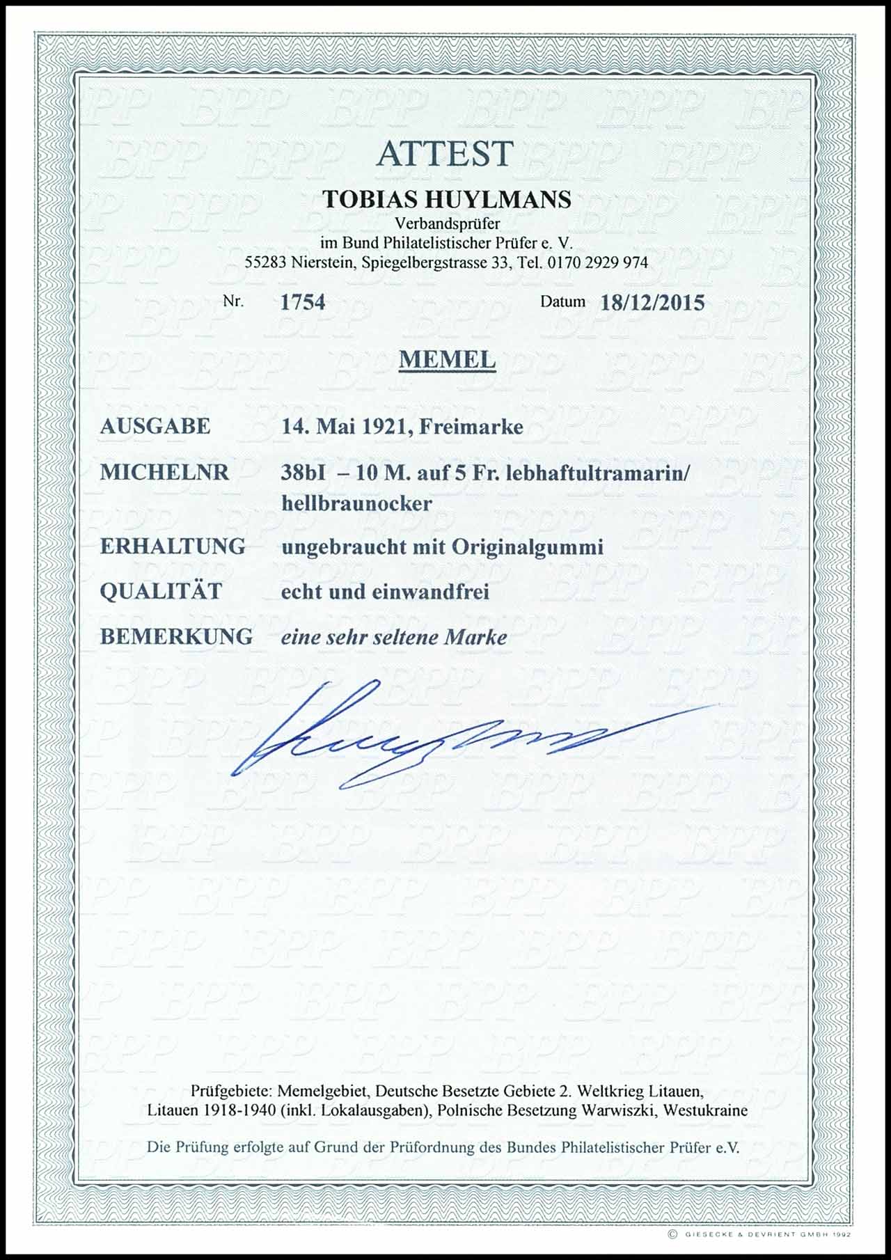 5 Francs mit rotem Buchdruckaufdruck "MEMEL 10 Mark" lebhaftgrauultramarin/hellbraunocker, ungebraucht, tadellose Erhaltung, Fotoattest Tobias Huylmans (2019), "echt und einwandfrei"