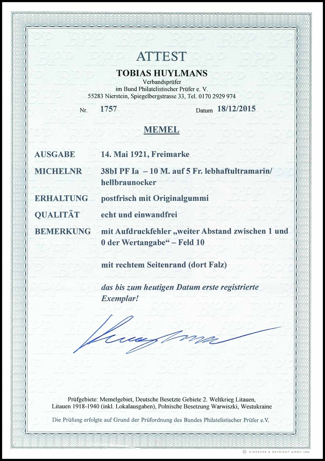 5 Francs mit rotem Buchdruckaufdruck "MEMEL 10 Mark" lebhaftgrauultramarin/hellbraunocker, rechtes Seitenrandstück, mit Aufdruckfehler Ia: "weiter Abstand zwischen 1 und 0 der Wertangabe, Feld10", postfrisch, tadellose Erhaltung, Fotoattest Tobias Huylmans (2019), "echt und einwandfrei", Mi. 600.-+