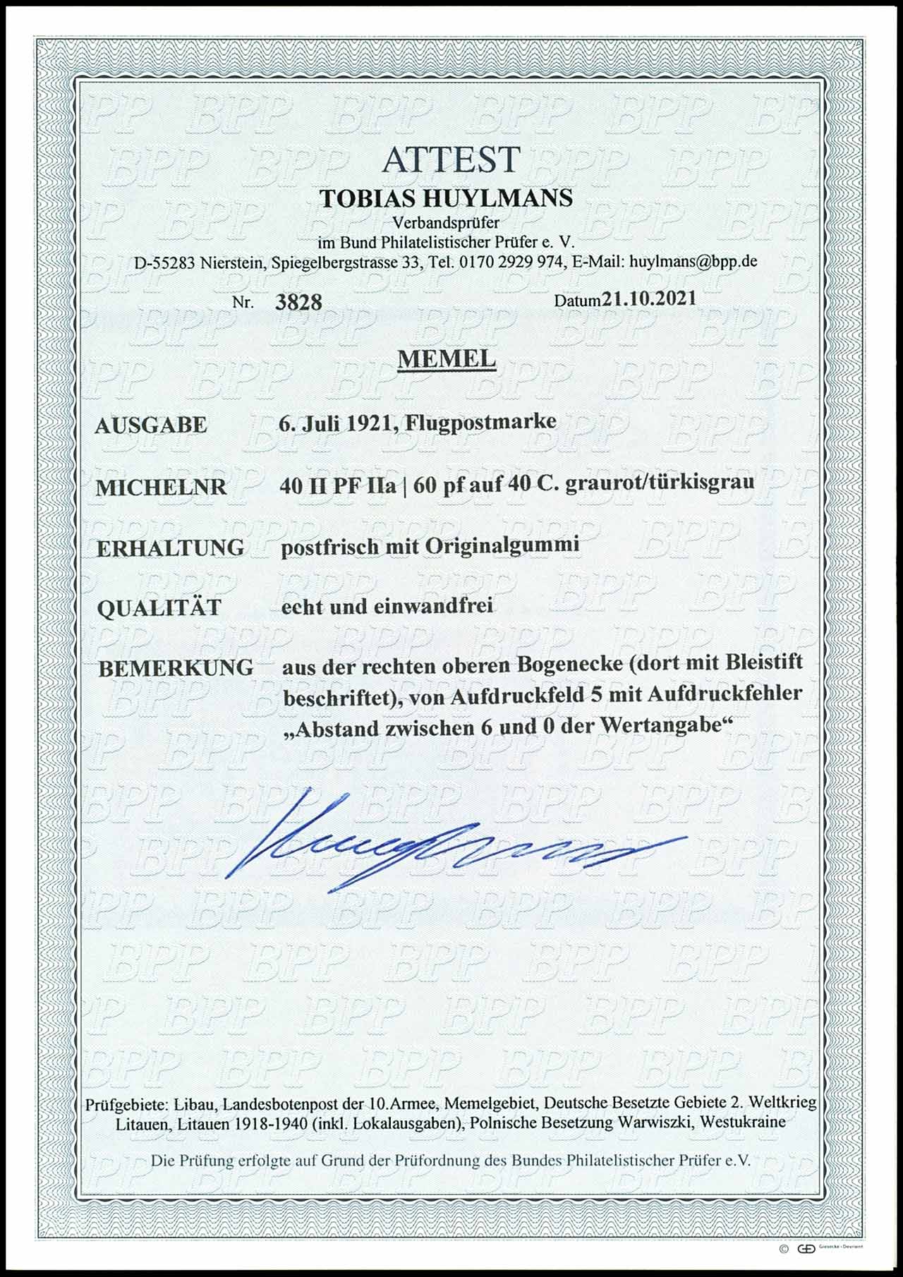 40 Centimes mit schwarzem Buchdruckaufdruck "MEMEL 60 pfennig" und schrägem, dunkelblauem Aufdruck "FLUGPOST", dunkelgraurot/türkisgrau auf weißem Papier, rechtes oberes Eckrandstück vom Bogenfeld 5 mit Aufdruckfehler IIa: ,Abstand zwischen 6 und 0 der Wertangabe", bis auf die Bleistiftnotation im Bogenrand tadellose Erhaltung, Fotoattest Tobias Huylmans (2016), "echt und einwandfrei", Mi. 450.-