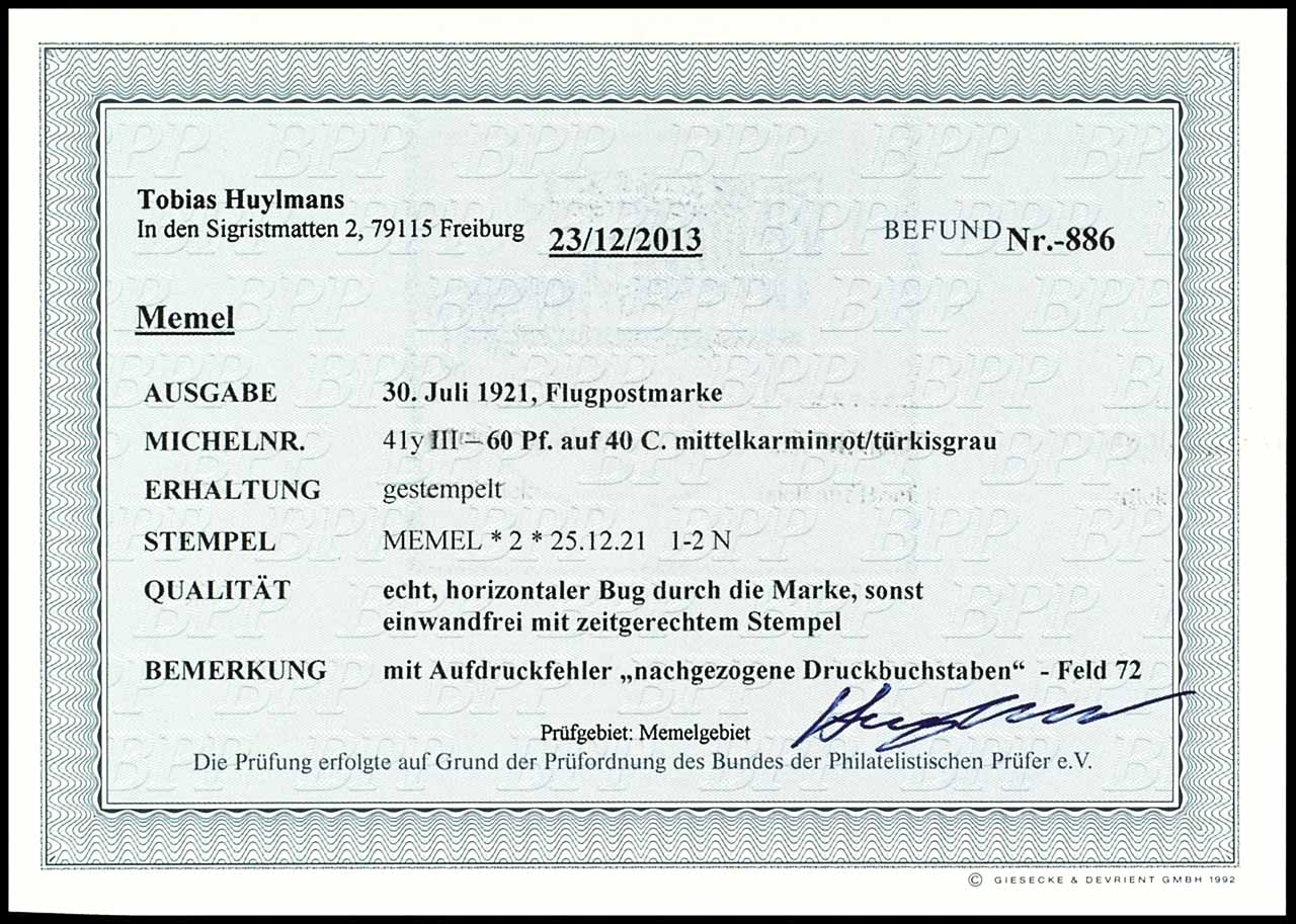 40 Centimes mittelkarminrot/türkisgrau mit schwarzem Aufdruck "MEMEL 60 Pfennig" und blauem Schrägaufdruck "Flugpost", weißes Papier, mit Aufdruckfehler III: "nachgezogene Druckbuchstaben", Unterrandstück mit Formnummer "32", gute Erhaltung, gestempelt "MEMEL * 2 * 25.12.21 1-2N", Befund Tobias Huylmans BPP "horizontaler Bug durch die Marke, sonst einwandfrei", Mi. 450.-