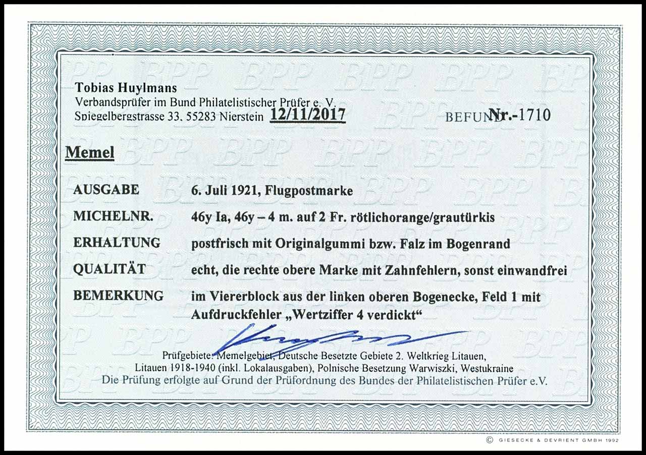 2 Francs rötlichorange/grautürkis mit schwarzem Aufdruck "MEMEL 4 Mark" und blauem Schrägaufdruck "Flugpost", Viererblock aus der linken oberen Bogenecke, weißes Papier, linke obere Marke mit Aufdruckfehler I: "Wertziffer 4 verdickt", postfrisch, Falz im Oberrand, rechte obere Marke mit Zahnfehlern, sonst tadellos, Befund Tobias Huylmans BPP "rechte obere Marke mit Zahnfehlern, sonst einwandfrei", Mi. 360.-