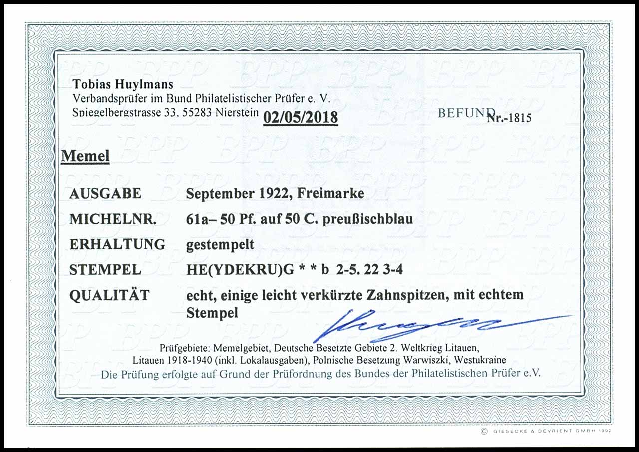 50 Pfennig auf 50 Centimes, preußischblau, gestempelt "HE(IDEKRU)G * * b 2-5.22 3-4", sehr gut erhalten, Befund Tobias Huylmans BPP (2018) "einige leicht verkürzte Zahnspitzen", Mi. 450.-