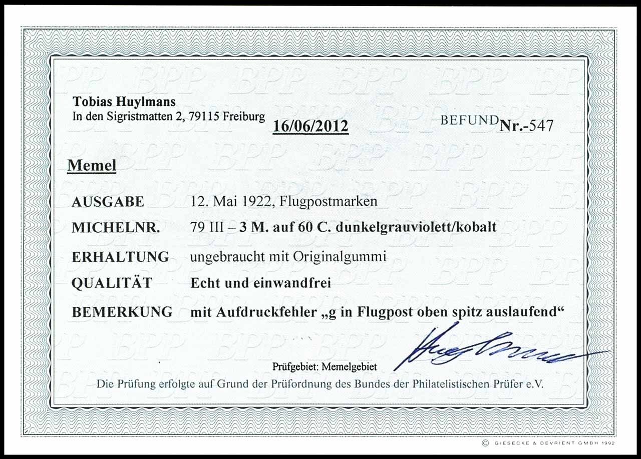 60 Centimes dunkelgrauviolett/kobalt mit rotem Aufdruck "MEMEL 3 Mark" und dunkelblauem Schrägaufdruck "Flugpost", mit Aufdruckfehler III: "g in Flugpost oben spitz zulaufend", tadellos, ungebraucht, Befund Tobias Huylmans BPP (2012) "echt und einwandfrei", Mi. 300.-