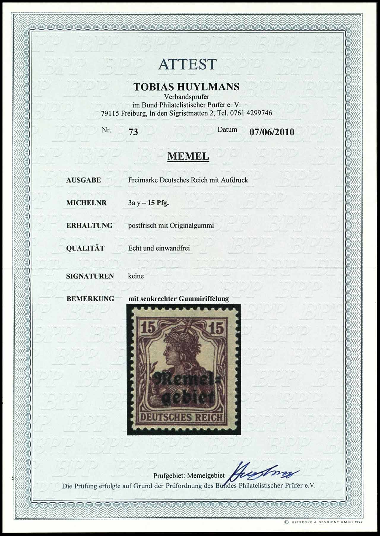15 Pfennig Germania mit Aufdruck "Memelgebiet", senkrechte Gummiriffelung, postfrisch, tadellose Erhaltung, unsigniert, Fotoattest Tobias Huylmans BPP "echt und einwandfrei", Mi. 1.700.-
