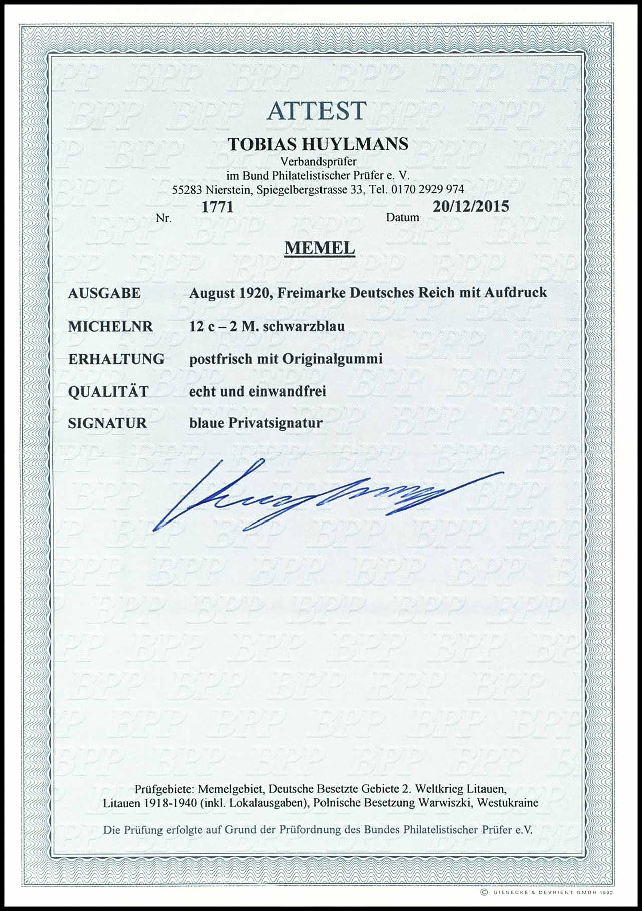 2 Mark schwarzblau mit Aufdruck "Memelgebiet, postfrisch, tadellose Erhaltung, Fotoattest Tobias Huylmans BPP "echt, einwandfrei", Mi. 1.000.-