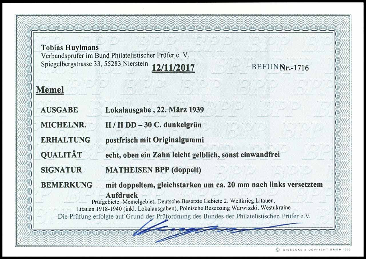 "Memelland ist frei!", 30 C. mit Aufdruck in Type II, Abart "doppelter Aufdruck", postfrisch, oben ein Zahn leicht gelblich sonst tadellos, Fotobefund Tobias Huylmans BPP