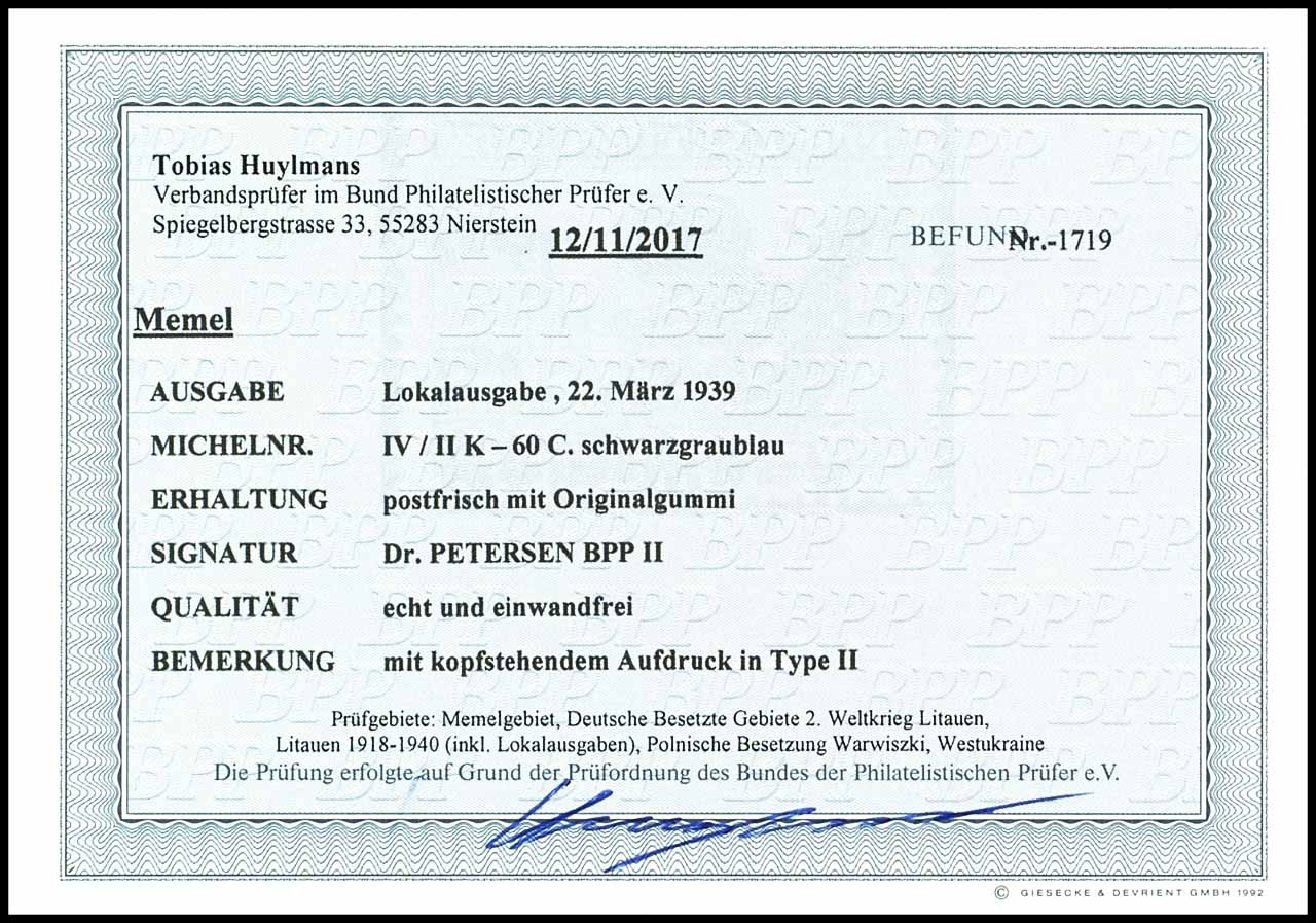 "Memelland ist frei!", 60 Cent schwarzgraublau mit Aufdruck in Type II, Abart "kopfstehender Aufdruck", postfrisch, tadellose Erhaltung, geprüft Dr. Petersen BPP, Fotobefund Tobias Huylmans BPP "echt und einwandfrei", Mi. 380.-