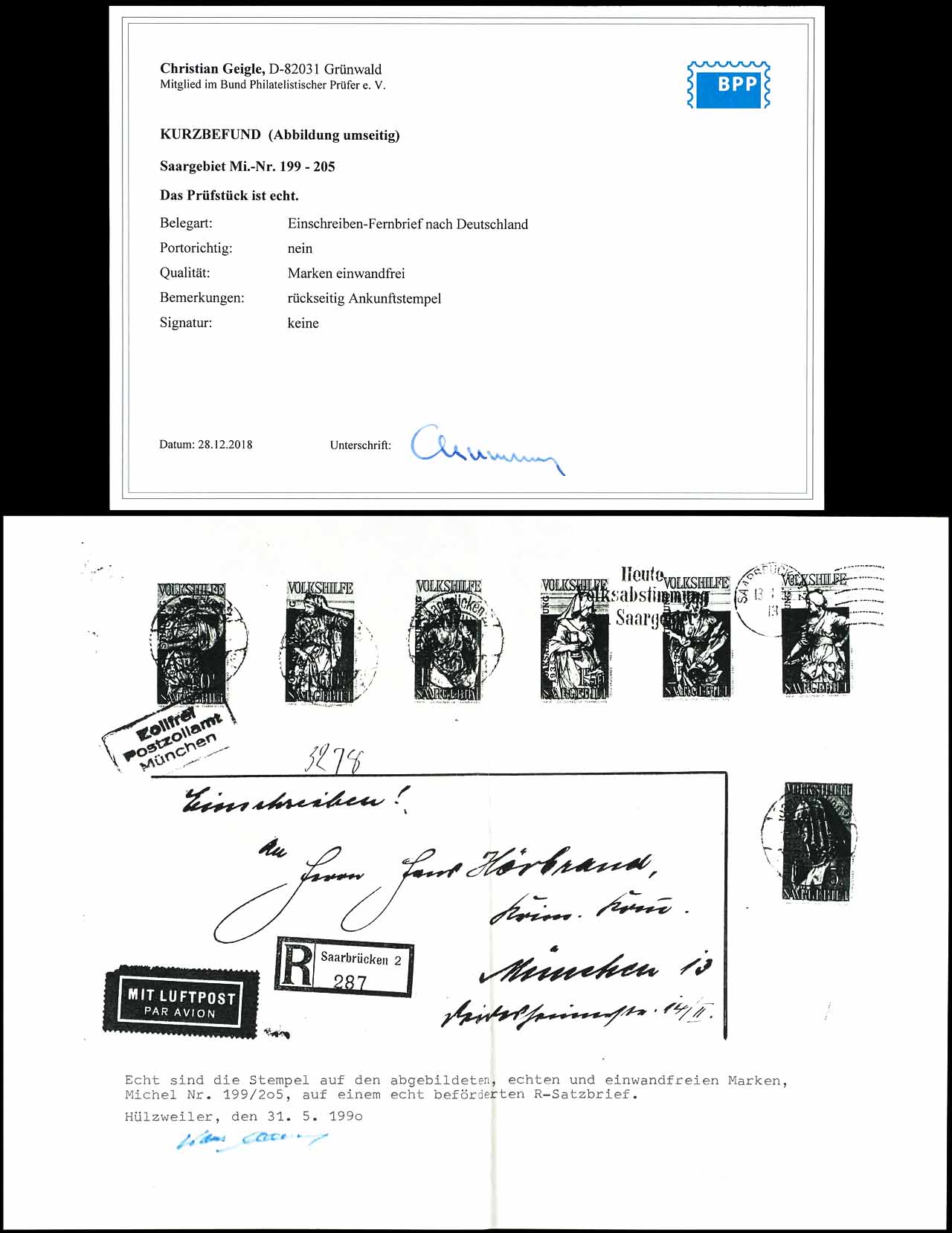 40 Centimes bis 5 Francs Volkshilfe 1934, Standbilder aus Saarbrücker Kirchen, mit farbigem Aufdruck "VOLKSABSTIMMUNG 1935", kompletter Satz mit 7 Werten, gestempelt "Saarbrücken 2 13.1.35" am Tag der Volksabstimmung und letzter Verwendungstag, auf eingeschriebenem Satzbrief nach München, rückseitig die Ankunfsstempel Münchner Bahnhof und München 13, tadellose Erhaltung, Befund Hoffmann BPP und Geigle BPP, Mi. 300.-+