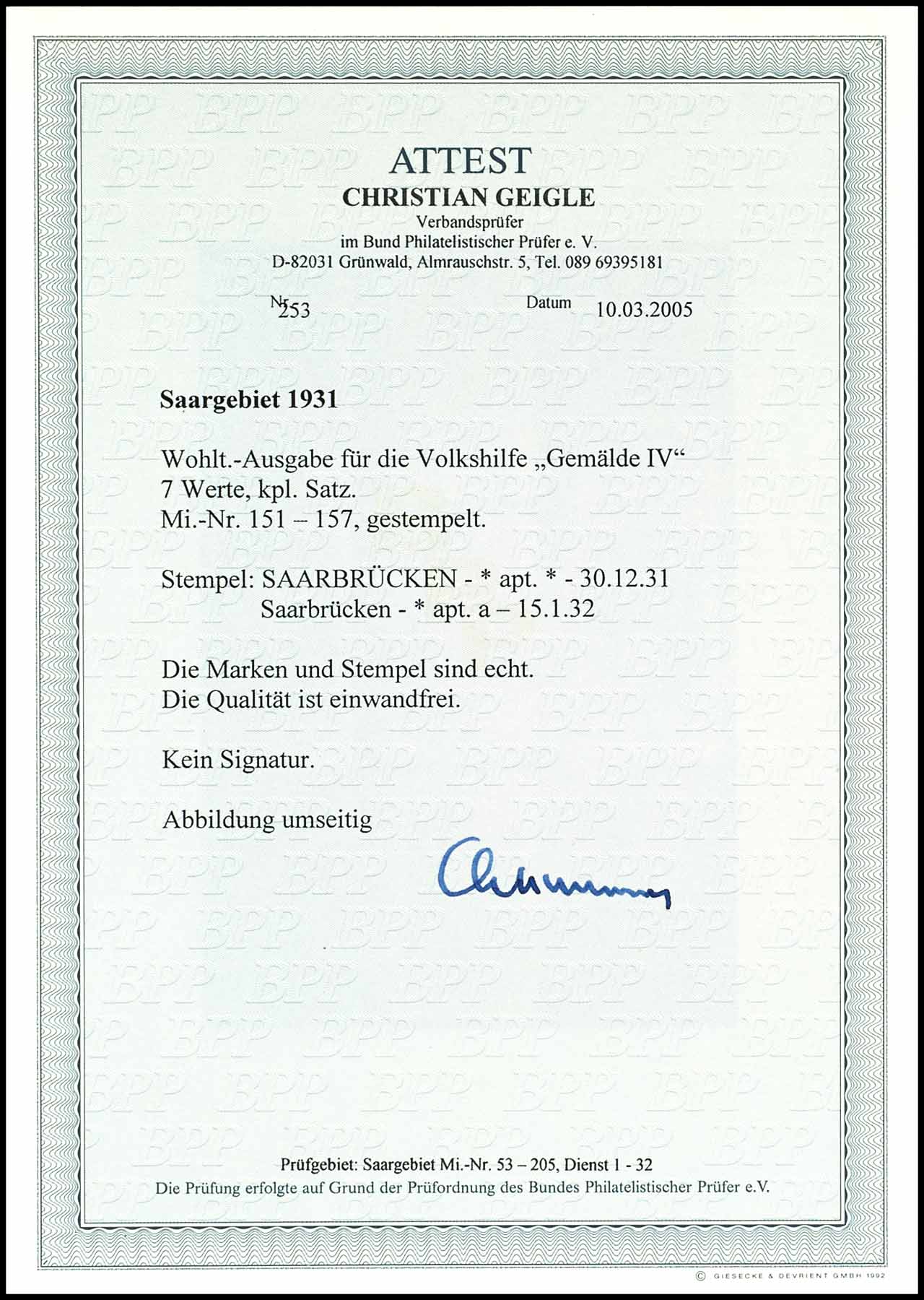 40 Cent bis 5 Fr. Volkshilfe 1931, kompletter Satz mit sieben werten, gestempelt "SAARBRÜCKEN", tadellose Erhaltung, Fotoattest Christian Geigle BPP "Die Qualität ist einwandfrei", Mi. 800.-