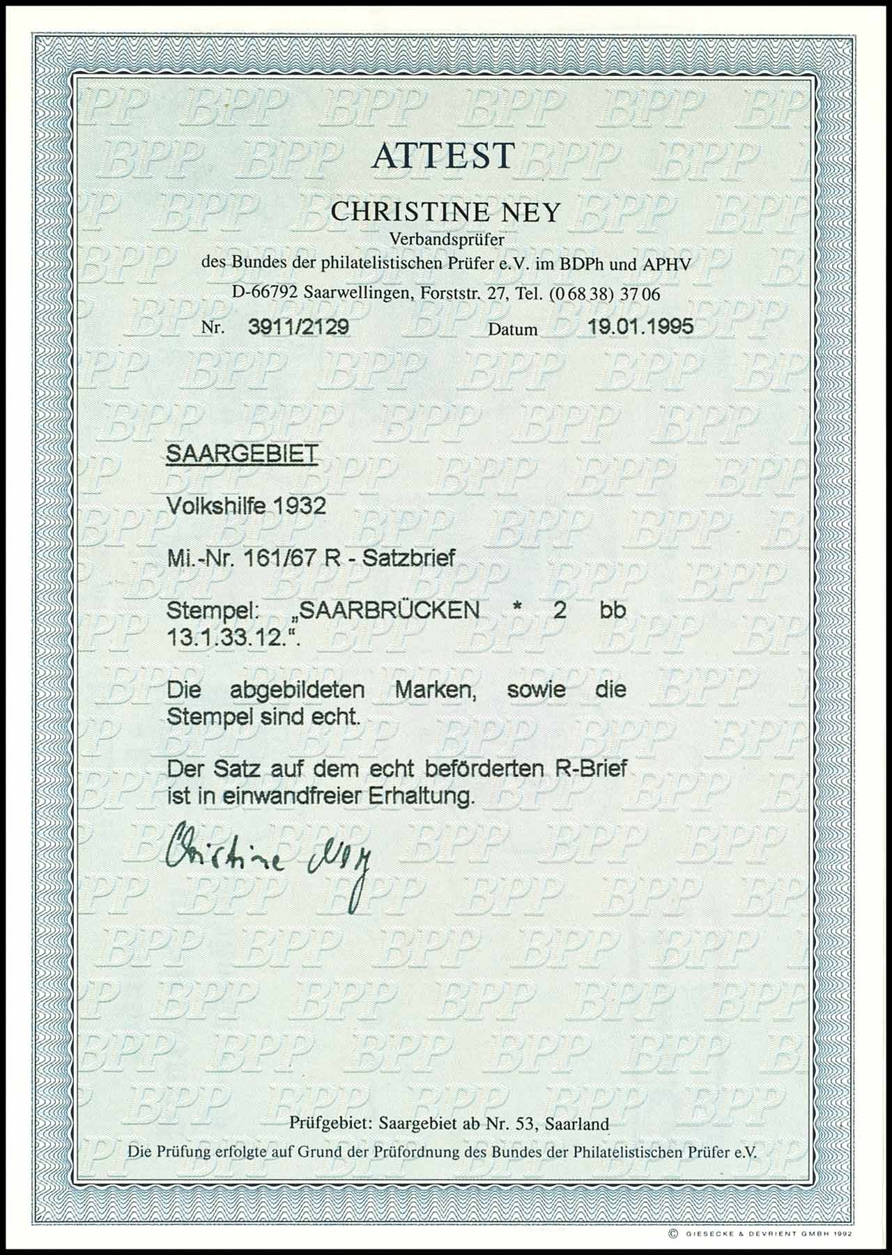 40 Cent bis 5 Fr. Volkshilfe 1932, kpl. Satz auf R-Brief mit Entwertung "Saarbrücken * 2 bb -13.1.33", Fotoattest Christine Ney BPP "in einwandfreier Qualität.", Mi. für lose 800.-