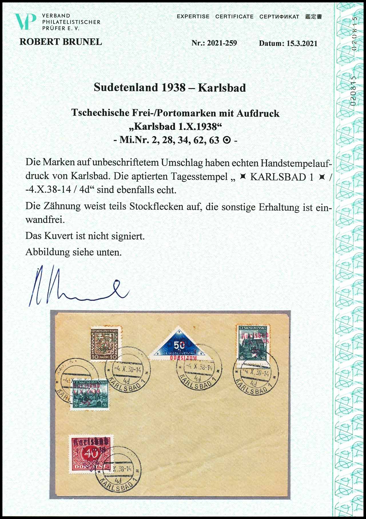 50 Heller Zustellungsmarke schwärzlichultramarin mit dunkelrosanem Handstempelaufdruck mit 40 Heller Portomarke, und Freimarken zu 50 heller und 10 Heller auf Brief mit Entwertung "KARLSBAD 1 4.X.38", stockfleckig sonst tadellose Erhaltung, Expertise Robert Brunel VP (2021), Mi. 680.-