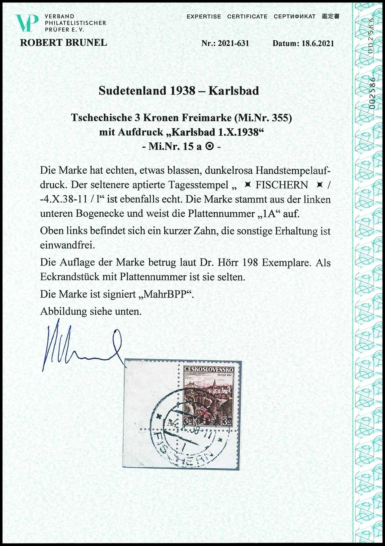 3 Kc. Freimarke mit Aufdruck in dunkelrosa, Eckrandstück unten links mit Plattennummer "1A", entwertet "FISCHERN -4.X.38", oben kurzer Zahn sonst tadellose Erhaltung, Auflage nur 198 Exemplare - als Eckrandstück mit Plattennummer selten, signiert Mahr BPP, Expertise Robert Brunel VP (2021)