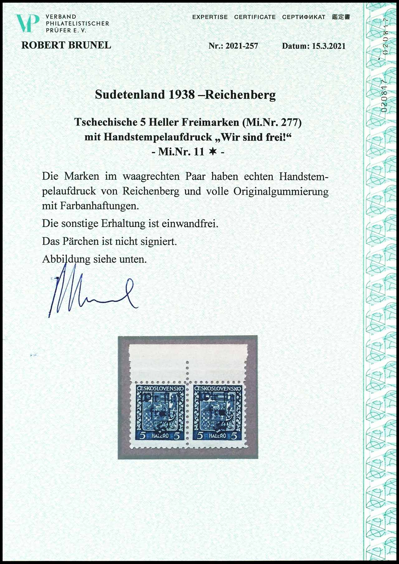 5 Heller Staatswappen mit Handstempelaufdruck "Wir sind frei! + Hakenkreuz", waagerechtes Paar vom Oberrand, ungebraucht mit Originalgummierung, tadellose Erhaltung, Expertise Robert Brunel VP (2021) "Die Erhaltung ist einwandfrei.", Mi. 400.-