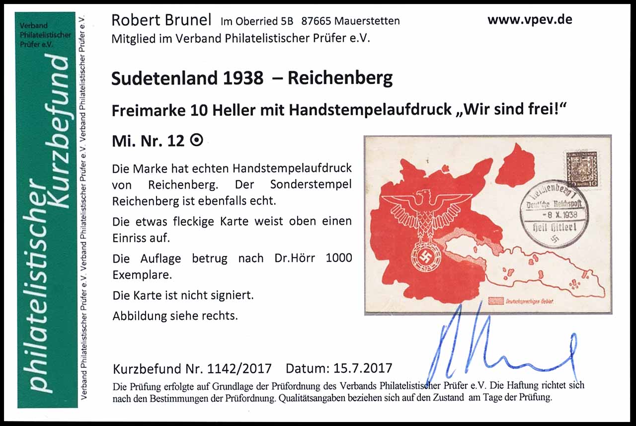 10 Heller Freimarke auf blankogestempelter Karte, entwertet mit Sonderstempel "REICHENBERG 1 8.X.1938", Karte oben kleiner Einriss, im Übrigen tadellose Erhaltung, Fotobefund Robert Brunel VP