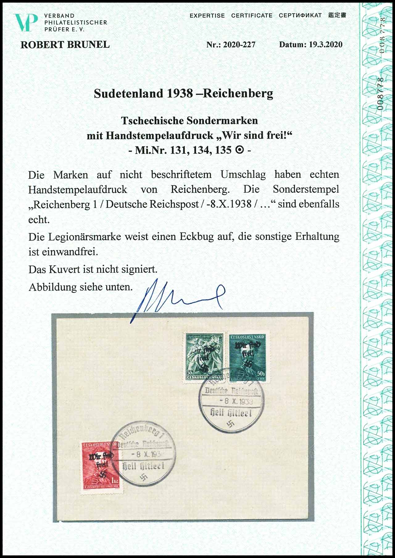 50 Heller und 1 Krone Fügner sowie 50 Heller Doss Alto (Eckbug) auf Blankoumschlag mit Sonderstempel "REICHENBERG 1 / -8.X.1938", bis auf den erwähnten Eckbug in tadellose Erhaltung, Expertise Robert Brunel VP, Mi. 1.100.-