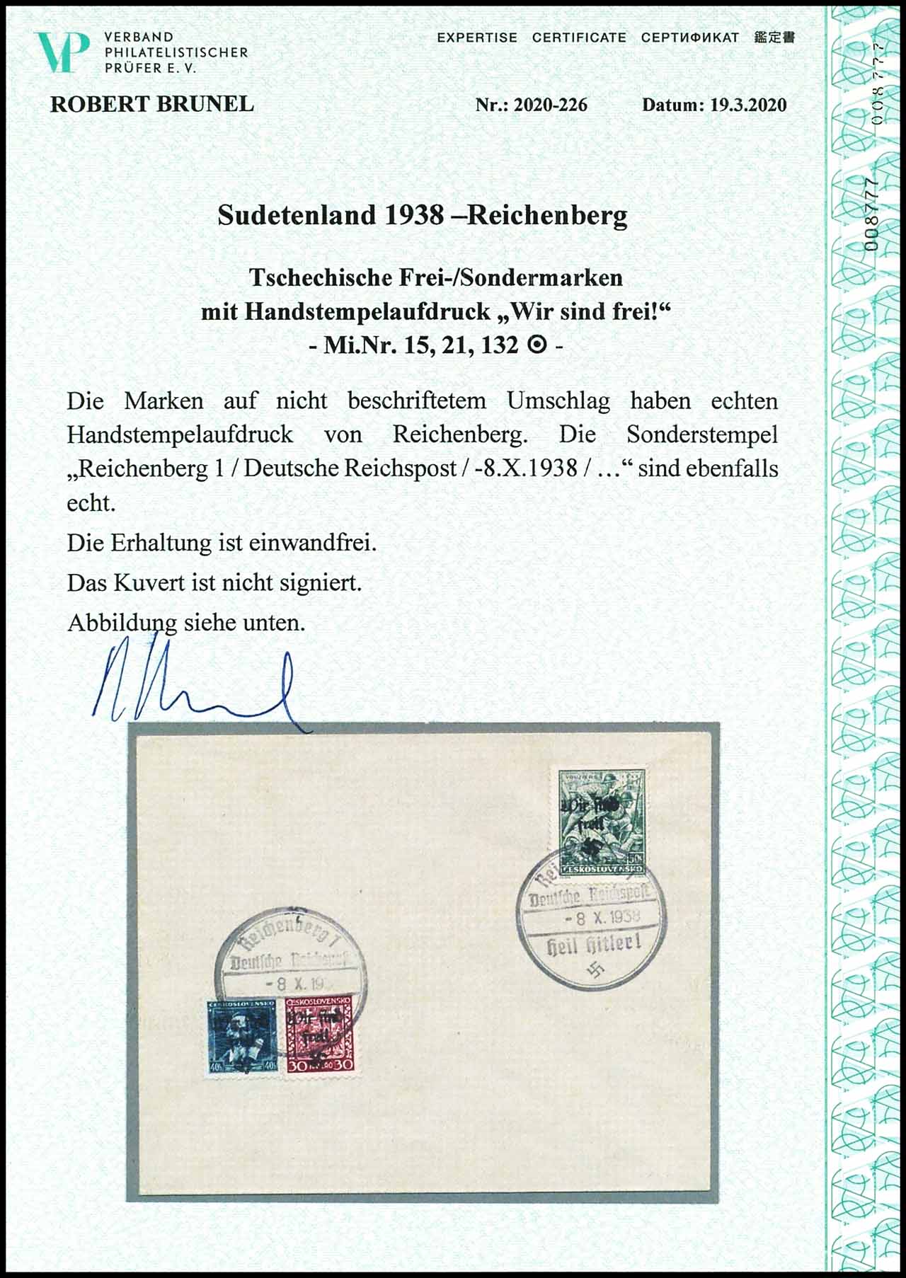 50 Heller Vouziers in Mischfrankatur mit 40 Heller und 30 Heller Freimarken auf Blankoumschlag mit Sonderstempel "REICHENBERG 1 -8.X.1938", tadellose Erhaltung, Expertise Robert Brunel VP "Die Erhaltung ist einwandfrei.", Mi. 500.-