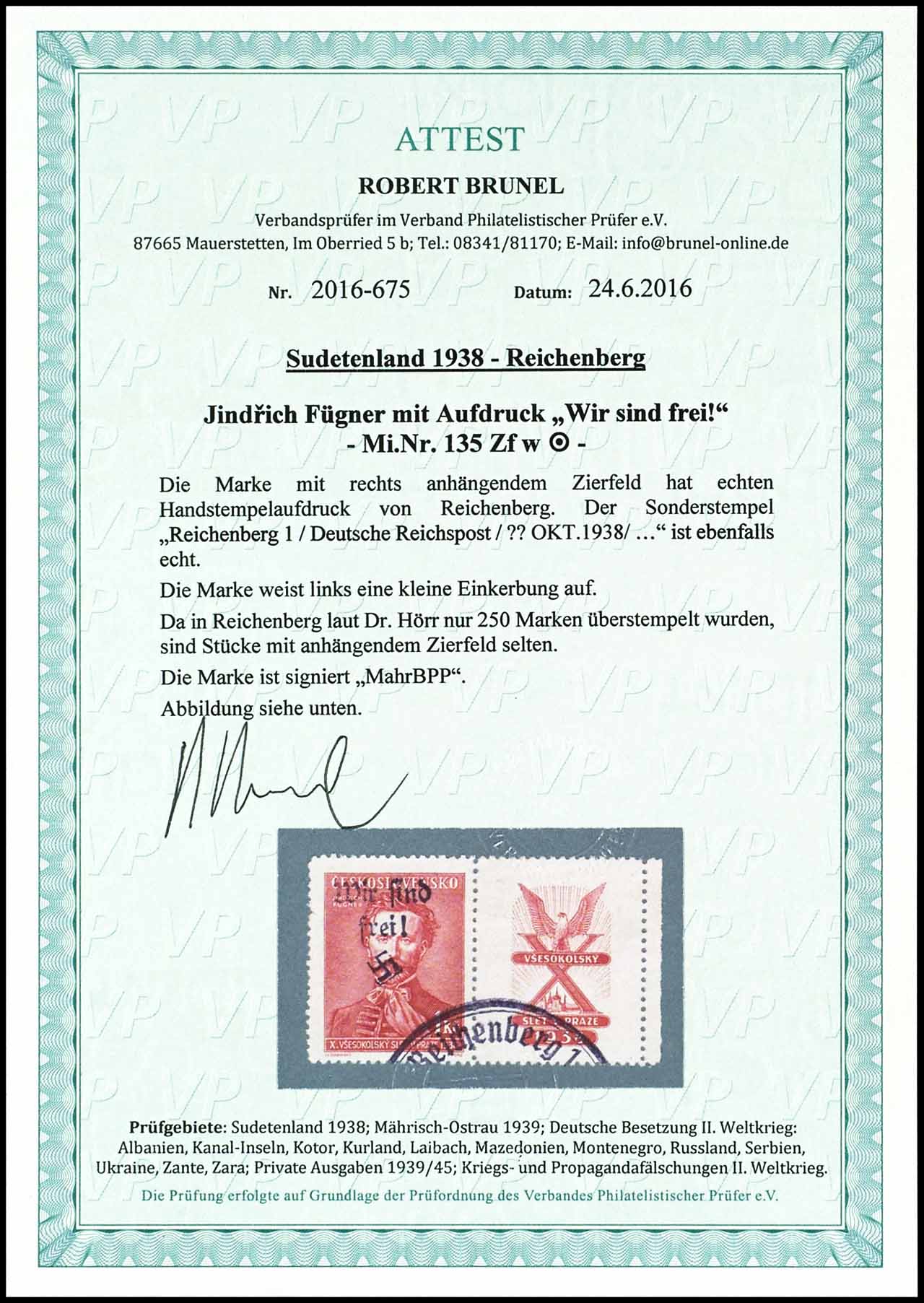 1 Krone Fügner mit rechts anhängendem Zierfeld mit Handstempelaufdruck "Wir sind frei! + Hakenkreuz", entwertet "REICHENBERG", Marke links kleine Einkerbung, aufgrund der Auflage von nur 250 Exemplaren sind Stücke mit Zierfeld selten, Fotoattest Robert Brunel VP, Mi. 600.-
