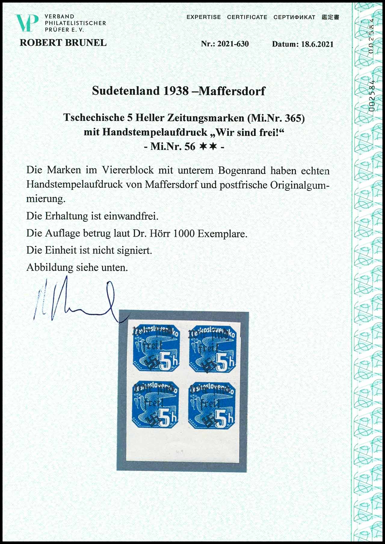 5 Heller Zeitungsmarke mit Handstempelaufdruck "Wir sind frei! + Hakenkreuz", Viererblock vom unteren Bogenrand, postfrisch, tadellose Erhaltung, Auflage nur 1.000 Exemplare, unsigniert, Expertise Robert Brunel VP "Die Erhaltung ist einwandfrei." Mi. 600.-