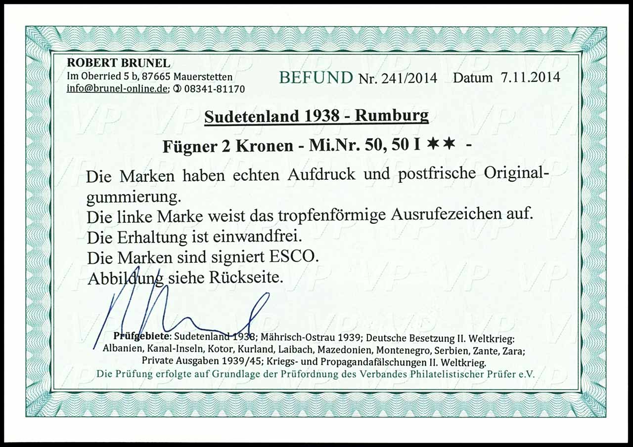 2 Kc. Fügner mit schwarzem Buchdruck-Aufdruck "Wir sind frei! + Hakenkreuz" und Aufdruck-Abart "tropfenförmiges Ausrufezeichen", waagerechtes Paar, postfrisch, tadellose Erhaltung, Fotobefund Robert Brunel VP "Die Erhaltung ist einwandfrei."
