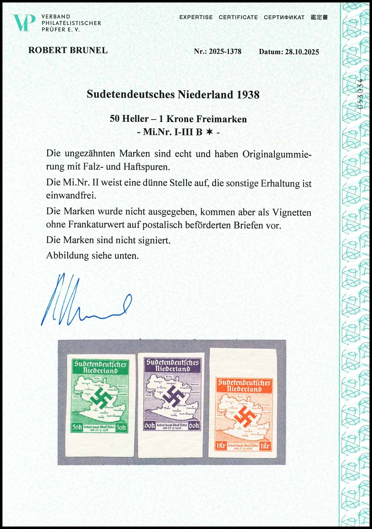 50 Heller - 1 Krone, nicht ausgegeben, ungezähnt, ungebrauchte Originalgummierung mit Falz- und Haftspuren, MiNr. II weist eine dünne Stelle auf, die beiden anderen Werte sind tadellos erhalten, Expertise Robert Brunel VP (2025), Mi. 350.-