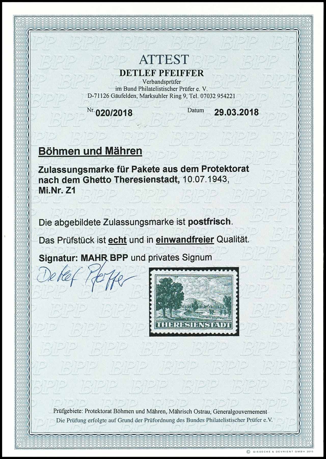 Zulassungsmarke für Pakete aus dem Protektorat nach dem Ghetto Theresienstadt, postfrisch, tadellose Erhaltung, signiert Mahr BPP et alia und Fotoattest Detlef Pfeiffer BPP (2018) "Das Prüfstück ist echt und in einwandfreier Qualität.", Mi. 800.-