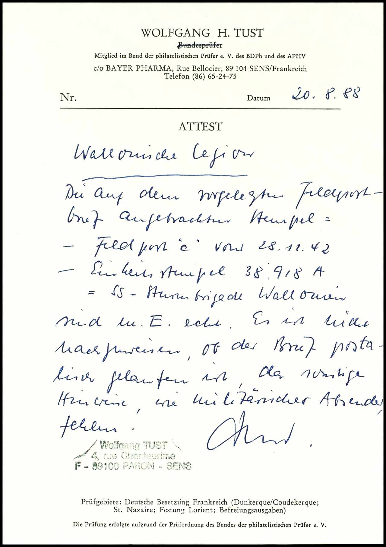 20 bis 100 Francs Wallonische Legion, Spendenvignetten, jeweils vom Oberrand auf Feldpost-Satzbrief nach Antwerpen, entwertet mit stummem Einkreis-Feldpost-Normstempel 28.11.42 und Dienstsiegelabschlag der Feldpost-Nr. 38918 A die Feldpostnummer der SS-Sturmbrigade Wallonien, in dieser Form selten zu bekommen, tadellose Erhaltung, geprüft Tust, Attest Wolfgang H. Tust BPP (1988), Mi. 300.-
