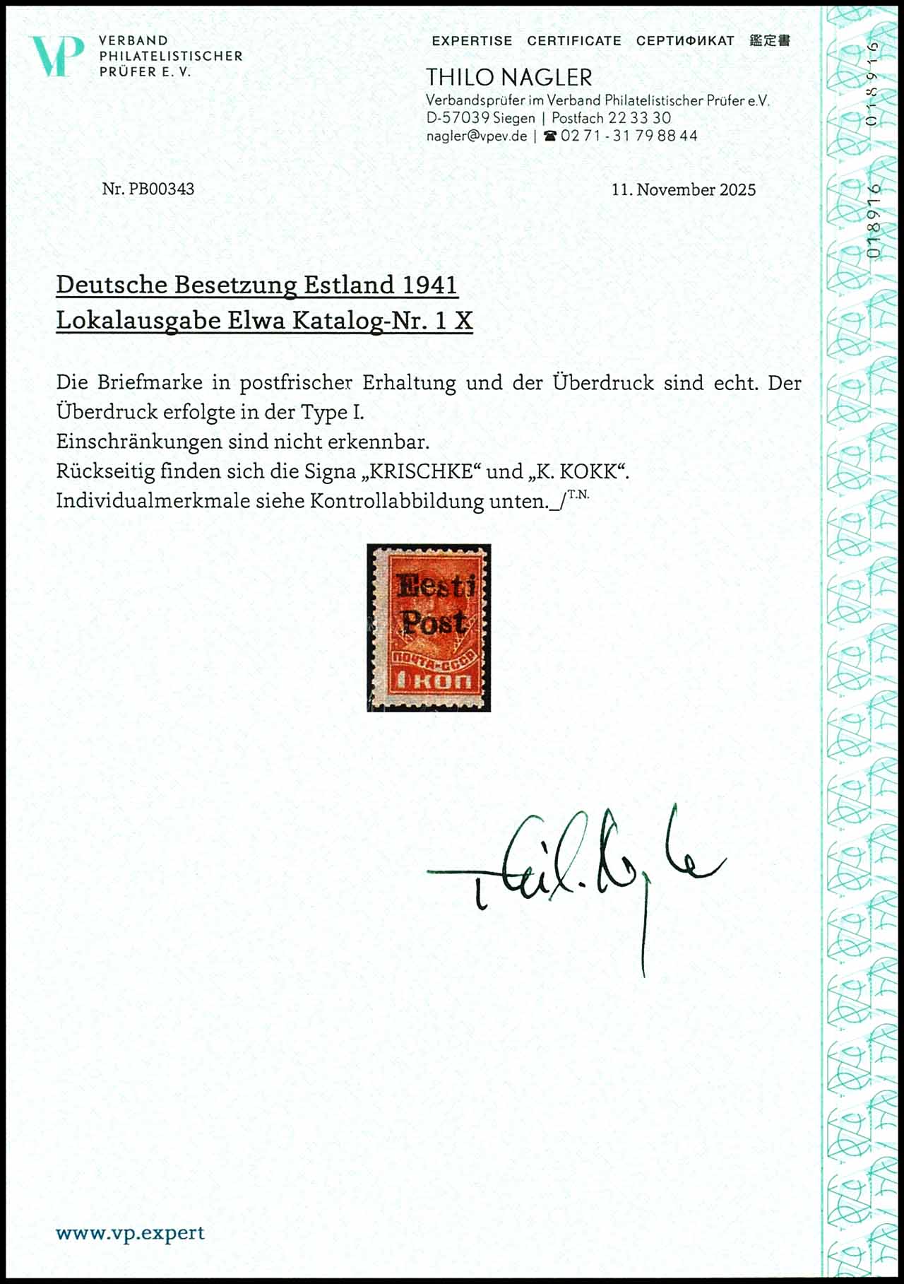 1 Kopeken Freimarke "Werktätige" mit Handstempel-Aufdruck "Eesti Post", Papier ohne Wasserzeichen, postfrisch, tadellose Erhaltung, Auflage 600 Stück, Expertise Thilo Nagler VP (2025) "echt und einwandfrei", Mi. 160.-
