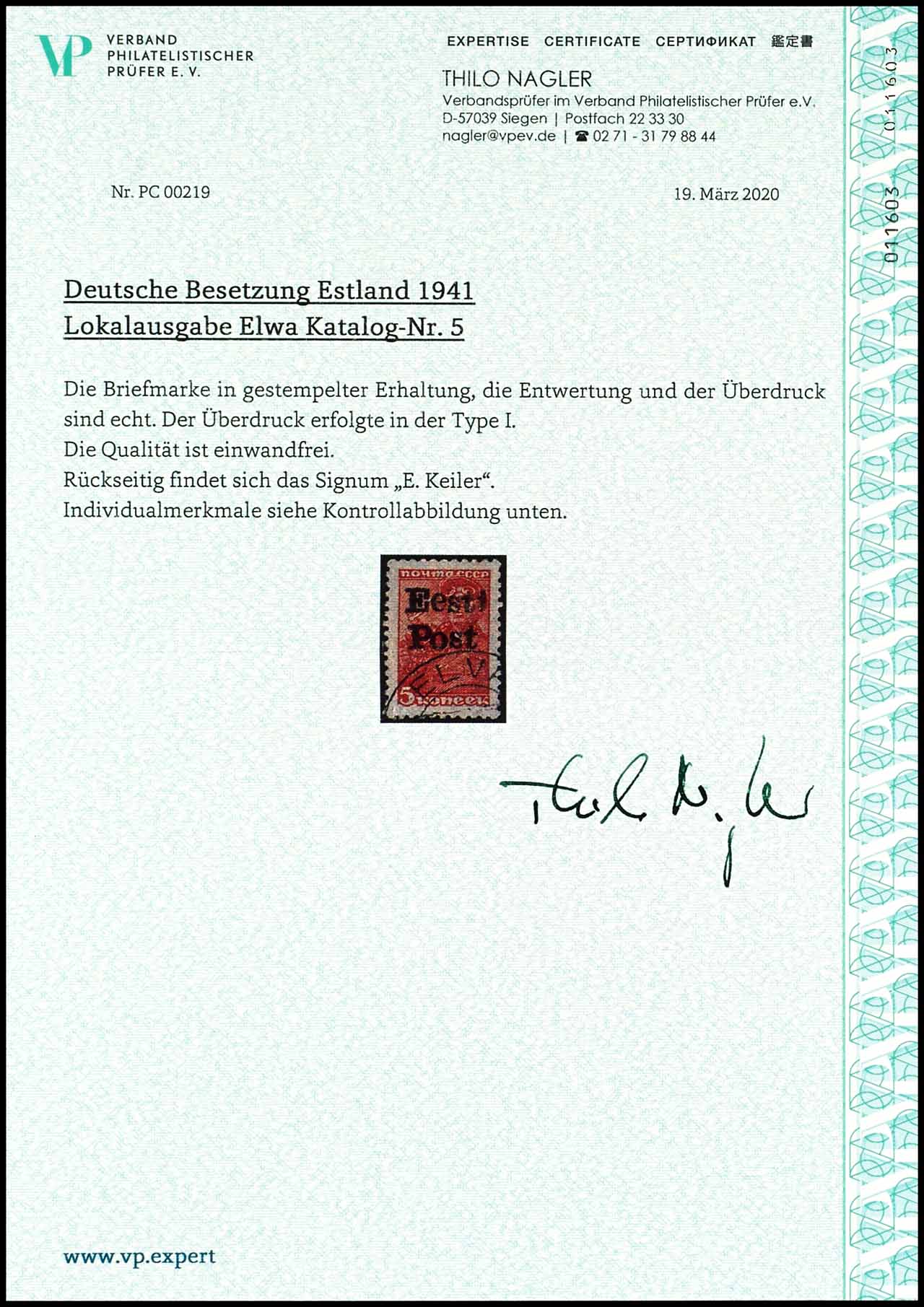 5 Kopeken Freimarke rotlila mit Handstempel-Aufdruck "Eesti Post", tadellos gestempelt, Auflage nur 600 Stück, geprüft E. Keiler, Expertise Thilo Nagler VP "Die Qualität ist einwandfrei.", Mi. 220.-