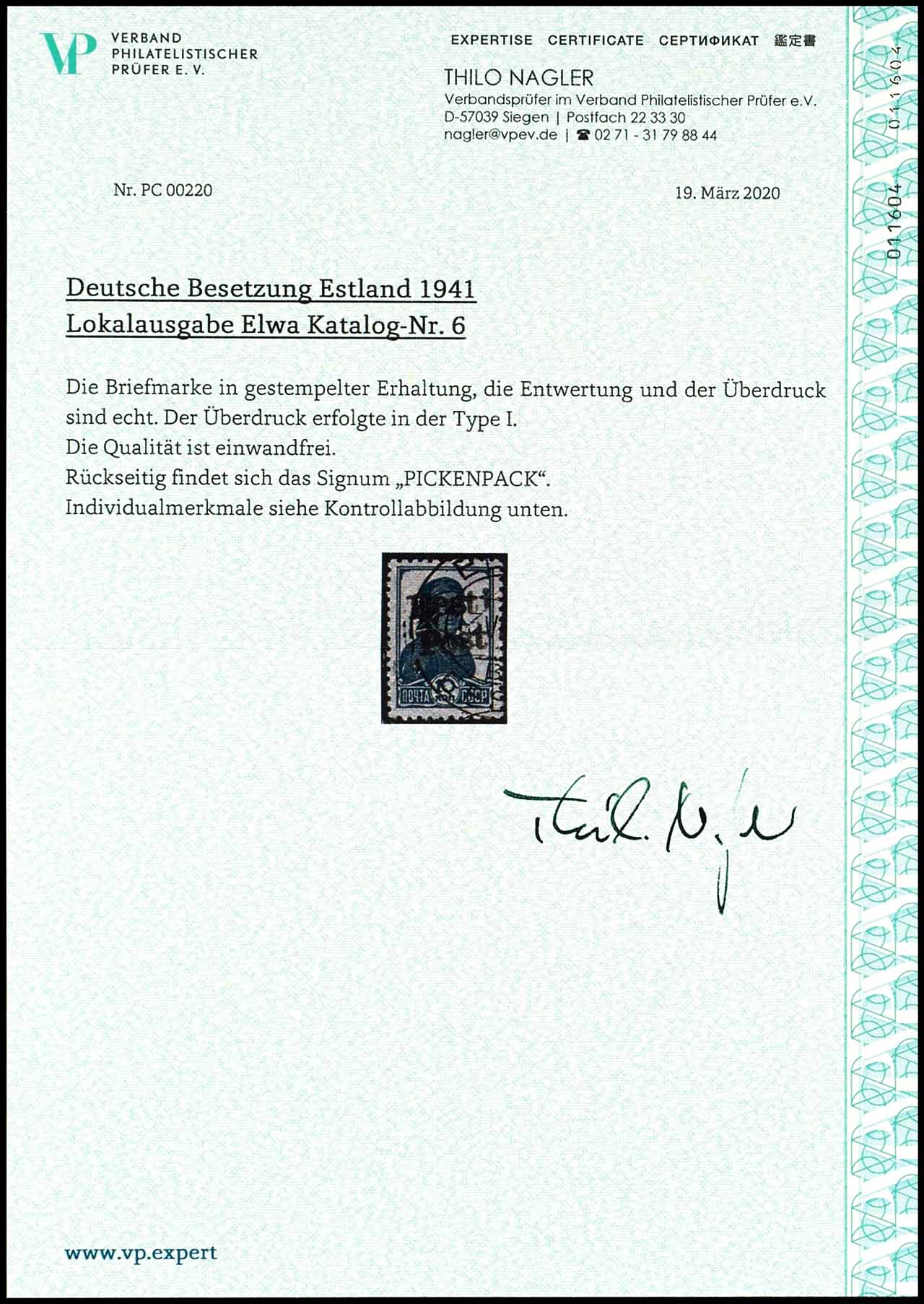 10 Kopeken dunkelpreußischblau mit Handstempel-Aufdruck "Eesti Post", tadellos gestempelt, Auflage nur 400 Stück, geprüft Pickenpack, Expertise Thilo Nagler VP "Die Qualität ist einwandfrei", Mi. 220.-