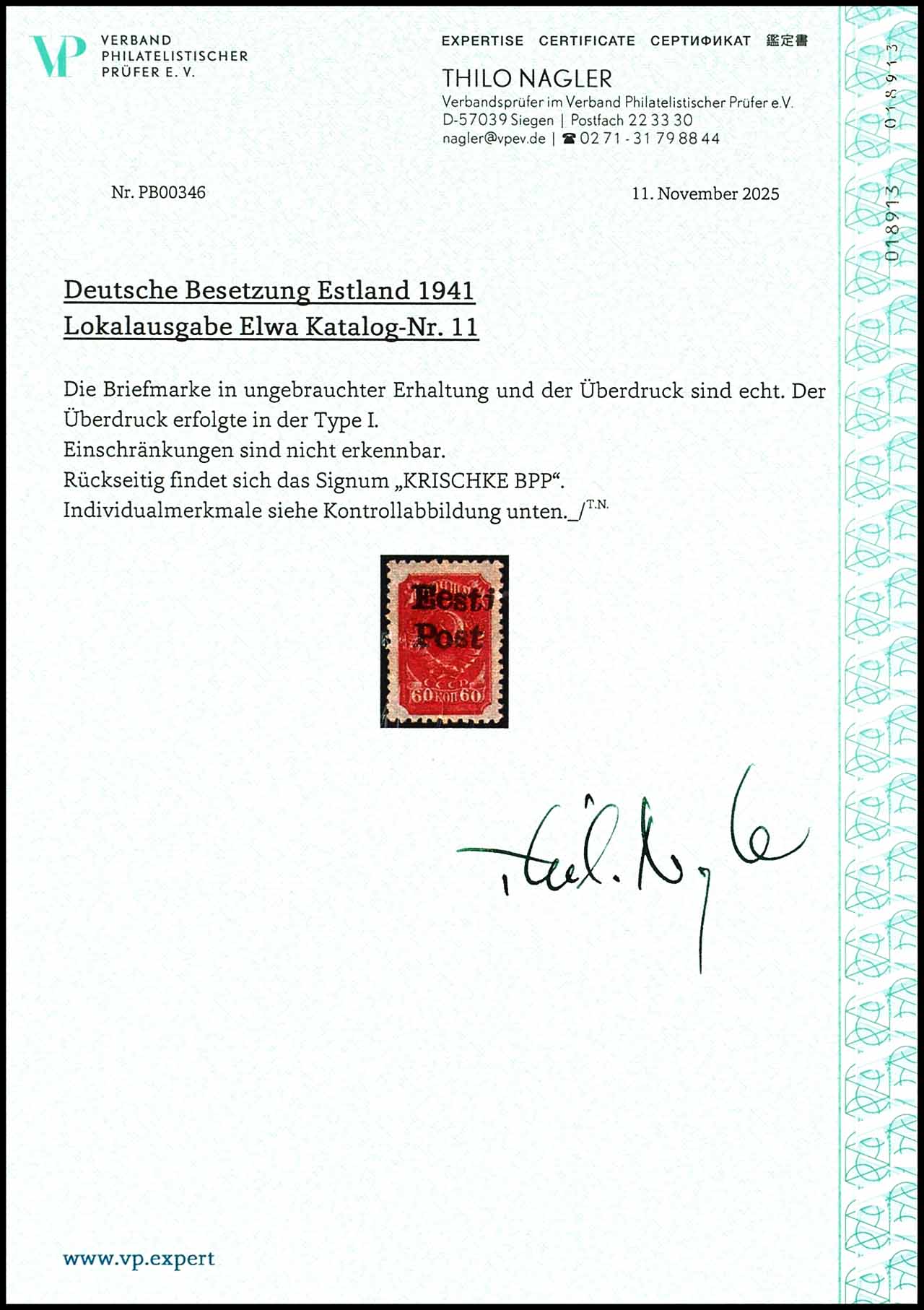 60 Kopeken lilarot mit Handstempel-Aufdruck "Eesti Post", ungebraucht mit Originalgummierung, tadellose Erhaltung, Auflage nur 600 Stück, Expertise Thilo Nagler VP (2025) "echt und einwandfrei", Mi. 320.-