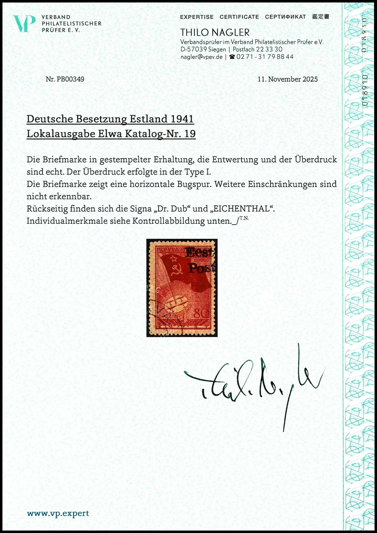 80 Kopeken "Lufttransport der Polarexpedition für die driftende Forschungsstation -Nordpol 1- zur Rudolfinsel" mit Handstempel-Aufdruck "Eesti Post", gestempelt, abgesehen von einer horizontalen Bugspur in tadelloser Erhaltung, Auflage nur 200 Exemplare, geprüft Eichenthal, Dr. Dub, Expertise Thilo Nagler VP (2025), Mi. 600.-