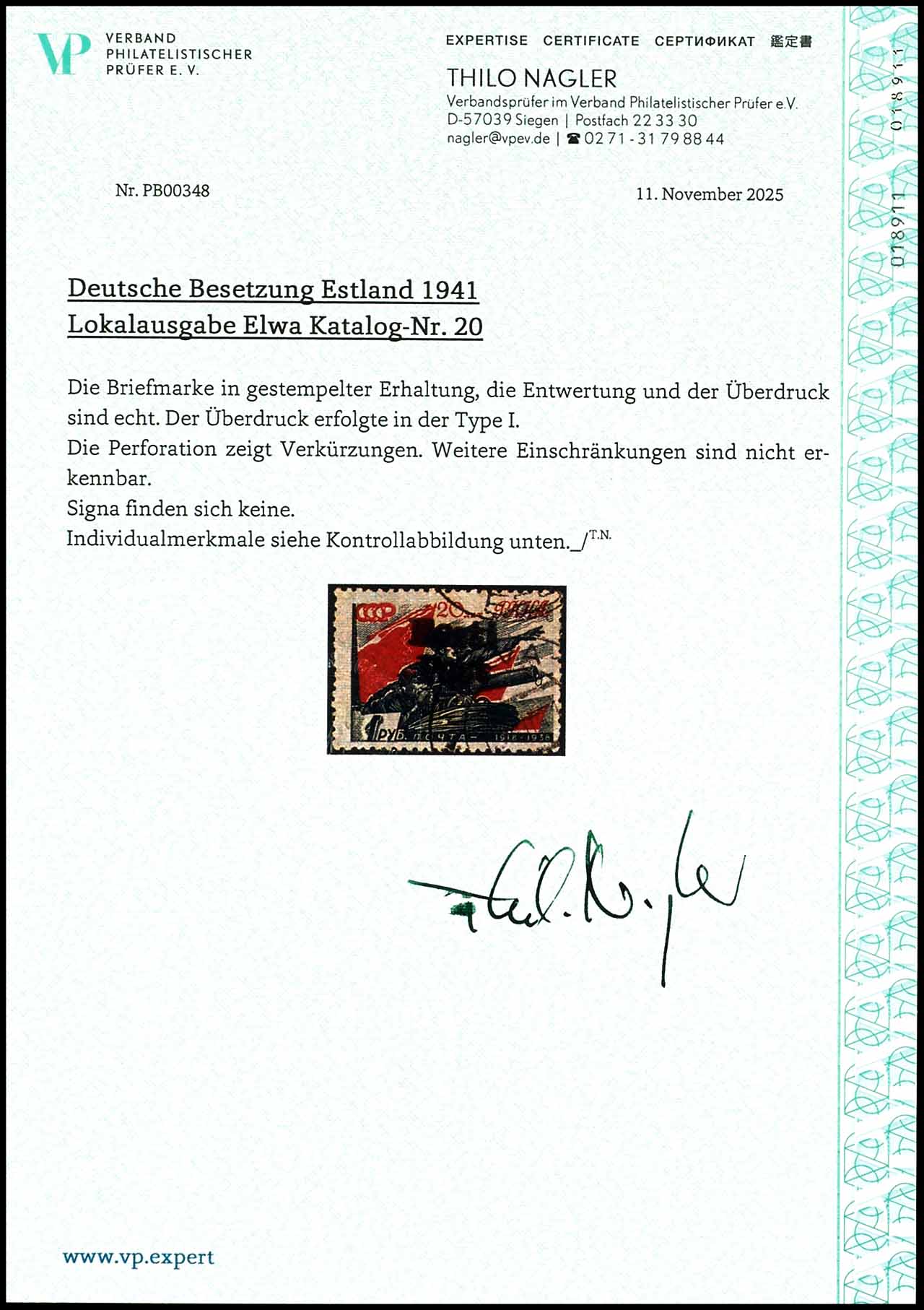 1 Rubel Freimarke mit Handstempel-Aufdruck "Eesti Post", gestempelt, abgesehen von Zähnungsunfeinheiten in tadelloser Erhaltung, Auflage nur 200 Exemplare, Expertise Thilo Nagler VP (2025), Mi. 600.-