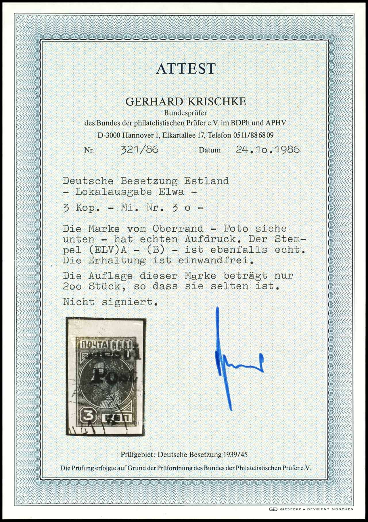3 Kopeken Freimarke hellblau mit Handstempel-Aufdruck "Eesti Post", tadellos gestempelt "ELVA -b-", Auflage nur 200 Exemplare, unsigniert, Fotoattest Gerhard Krischke BPP "Die Erhaltung ist einwandfrei.", Mi. 650.-