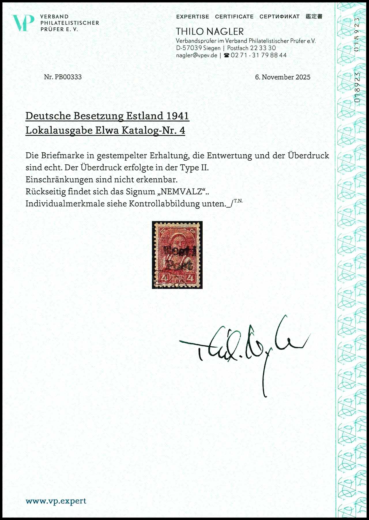 4 Kopeken Freimarke, rosalila mit Handstempel-Aufdruck "Eesti Post", tadellos gestempelt, Auflage nur 300 Stück, Expertise Thilo Nagler VP (2025) "echt und einwandfrei", Mi. 1.200.-