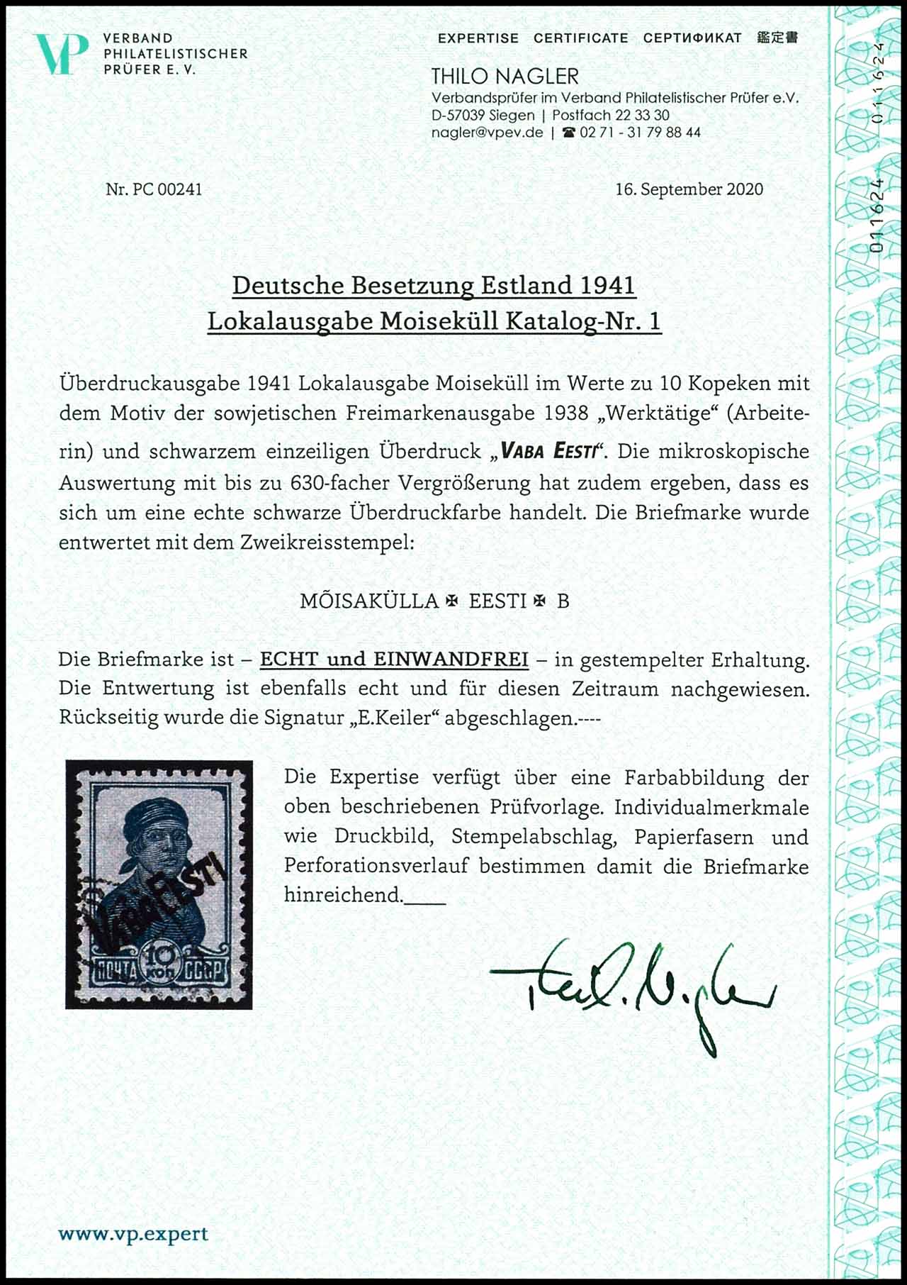 10 Kopeken Freimarke mit schwarzem Bdr.-Aufdruck "Vaba Eesti", gestempelt "MOISAKÜLLA + EESTI + B", tadellose Erhaltung, Auflage nur 500 Exemplare, geprüft E. Keiler, Expertise Thilo Nagler VP "echt und einwandfrei", Mi. 450.-