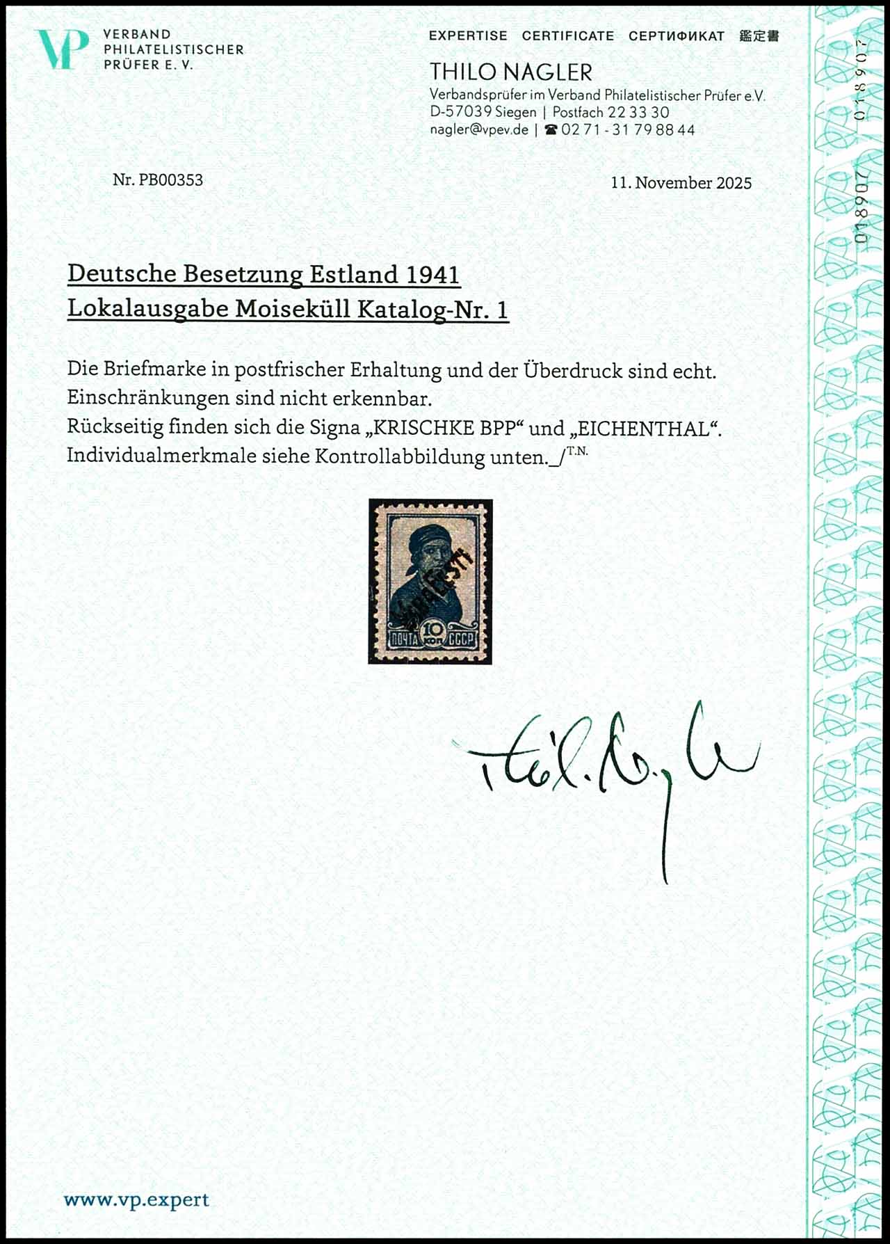 10 Kopeken Freimarke mit schwarzem Bdr.-Aufdruck "Vaba Eesti", postfrisch, tadellose Erhaltung, Auflage nur 500 Exemplare, geprüft Eichenthal, Krischke BPP und Expertise Thilo Nagler VP (2025), Mi. 500.-