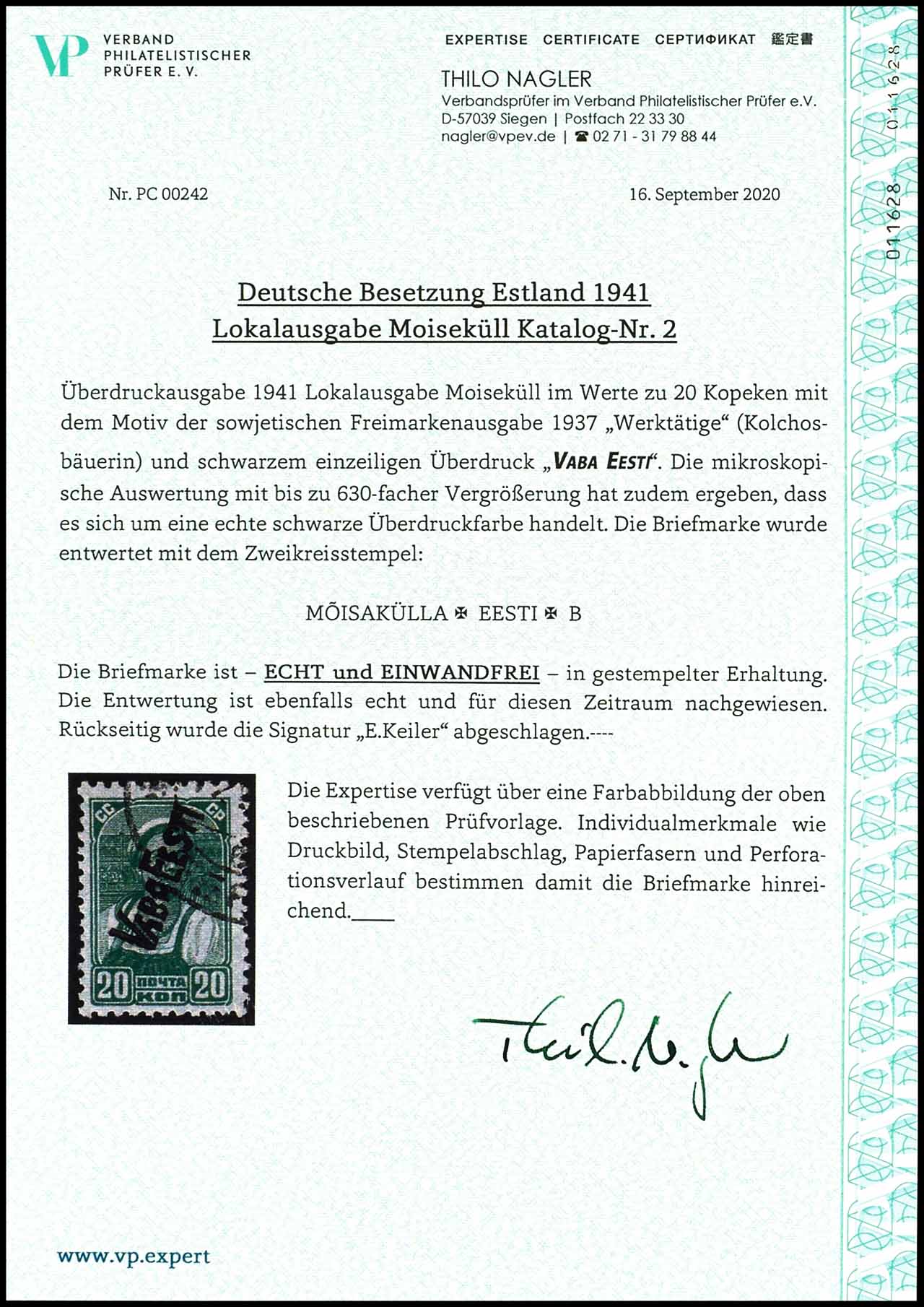 20 Kopeken Freimarke mit schwarzem Bdr.-Aufdruck "Vaba Eesti", gestempelt "MOISAKÜLLA + EESTI + B", tadellose Erhaltung, Auflage nur 1.000 Exemplare, Expertise Thilo Nagler VP "echt und einwandfrei", Mi. 300.-