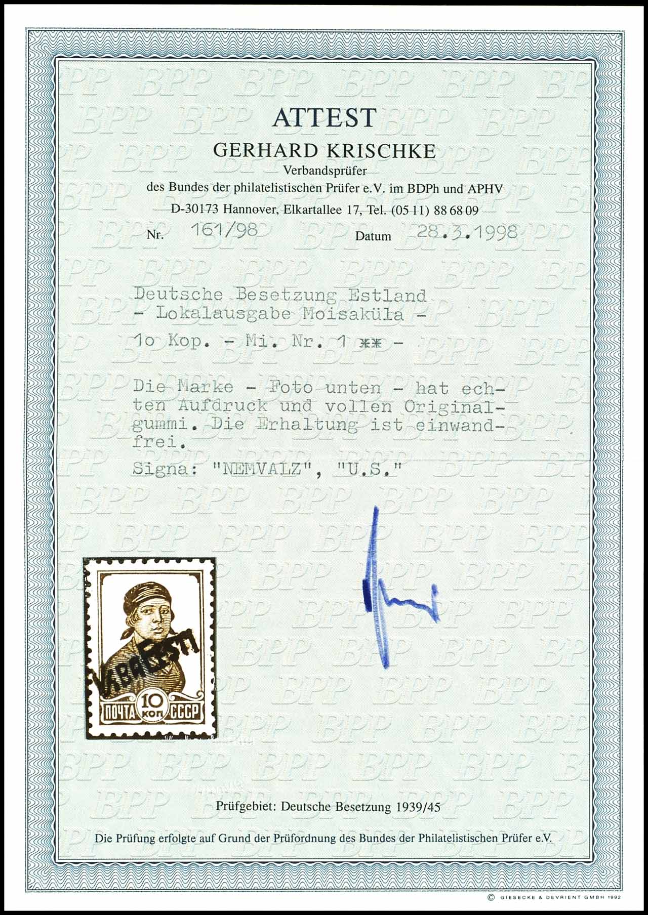 10 Kopeken Freimarke mit Aufdruck "VABA EESTI", tadellos postfrisch, geprüft Nemvalz u. a. sowie Fotoattest Gerhard Krischke BPP "Die Erhaltung ist einwandfrei." Mi. 500.-
