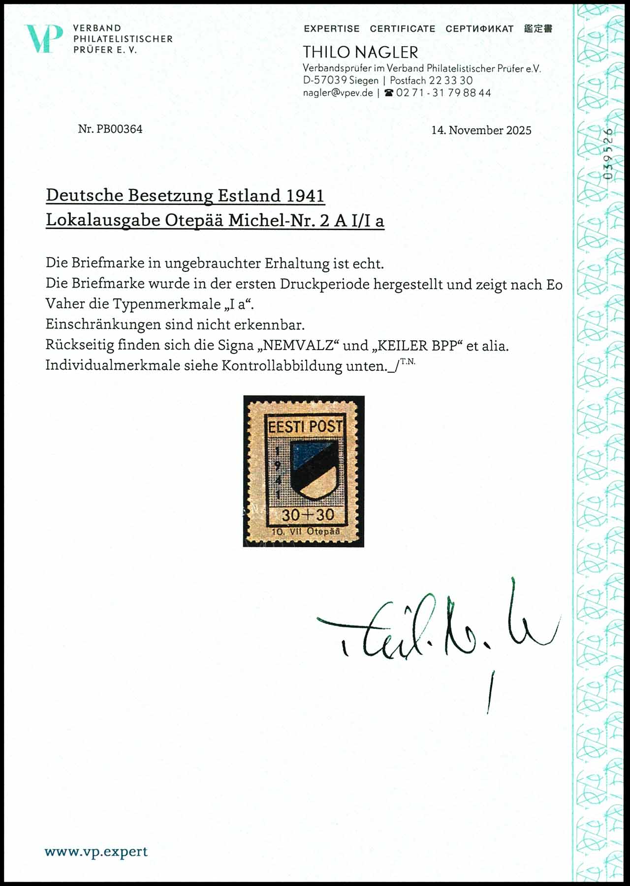 30 + 30 Kopeken Wappenzeichnung, gezähnt, Type I, 1. Druckperiode der 1. Auflage, Typenmerkmal Ia nach Eo Vaher, ungebraucht mit Originalgummierung, tadellose Erhaltung, geprüft Nemvalz, Keiler BPP, Expertise Thilo Nagler VP (2025), Mi. 150.-
