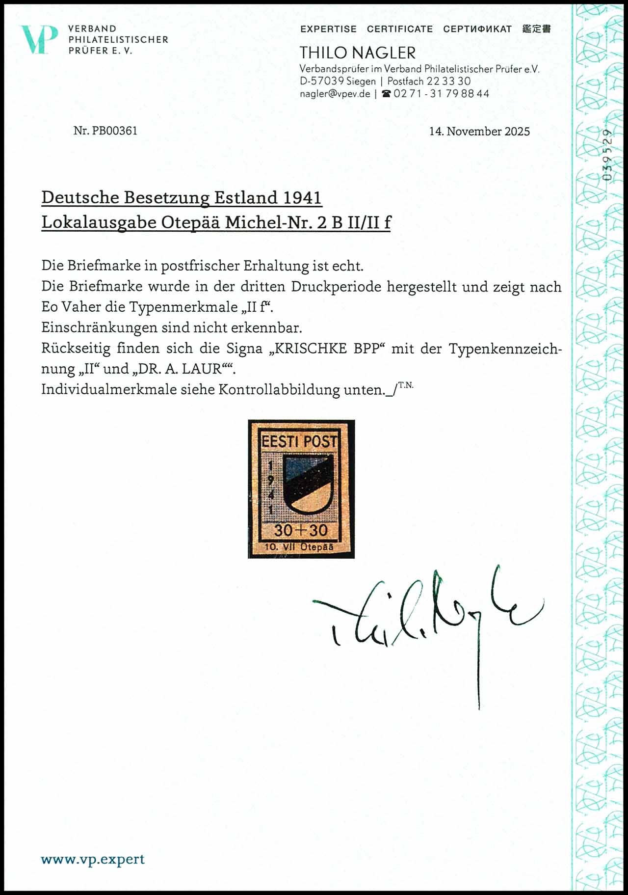 30 + 30 Kopeken Wappenzeichnung, geschnitten, Type II, 3. Druckperiode Typenmerkmal IIf nach Eo Vaher, postfrisch, tadellose Erhaltung, geprüft Krischke BPP, Dr. Laur und Expertise Thilo Nagler VP (2025), Mi. 300.-
