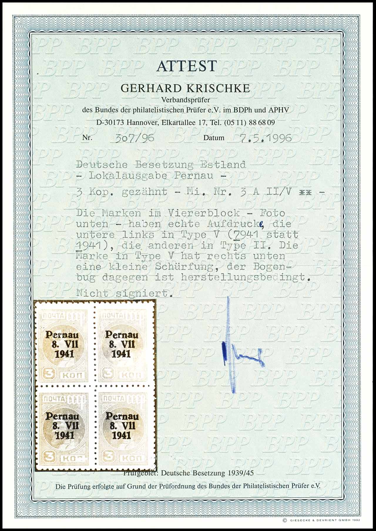 3 Kopeken Freimarke mit schwarzem Aufdruck "Pernau 8.VII 1941", gezähnt, Aufdruckfehler V "Jahreszahl im Aufdruck 7941" innerhalb eines Viererblocks mit drei Normalmarken, postfrisch, Marke mit Aufdruckfehler kleine Schürfung sonst tadellos mit herstellungsbedingtem Bogenbug, Auflage nur 122 Exemplare, unsigniert, Fotoattest Gerhard Krischke BPP , Mi. 1.950.-