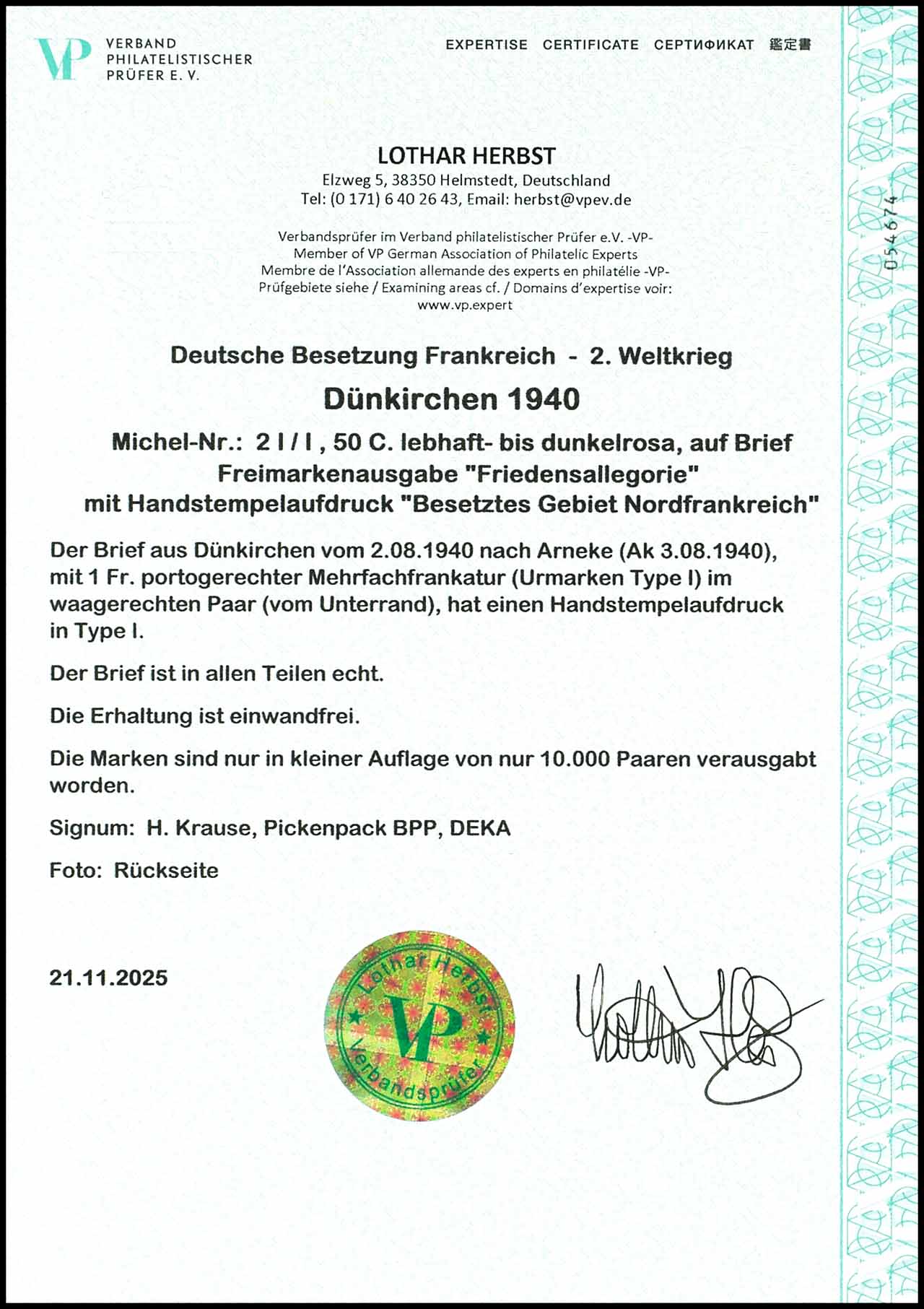 50 C. "Friedensallegorie" Type I mit Aufdruck "Besetztes Gebiet Nordfrankreich" in Type I, portogerechte Frankatur auf Brief mit Entwertung "Dunkerque 2.08.40" nach Arneke mit rückseitigem Ankunftsstempel vom 3.08.1940, Auflage nur 10.000 Paare, geprüft H.Krause, DEKA, Pickenpack sowie Expertise Lothar Herbst VP (2025) "Die Erhaltung ist einwandfrei.", Mi. 600.-