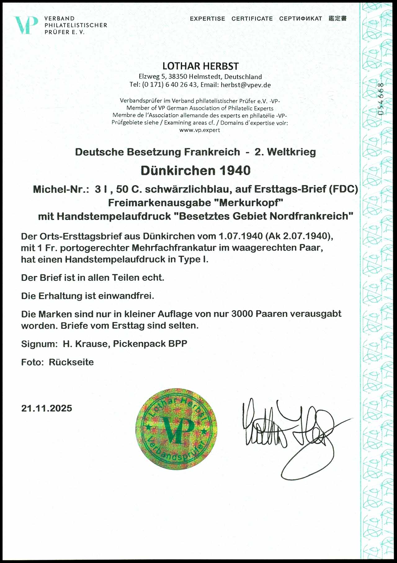 50 C. Freimarke "Merkurkopf" mit Aufdruck "Besetztes Gebiet Nordfrankreich" in Type I, portogerechte Frankatur auf Orts-Brief von "Dunkerque 1 7 40" (Ersttag) mit rückseitigem Ankunftsstempel vom 2.7.1940, tadellose Erhaltung, geprüft H. Krause, Pickenpack BPP und Expertise Lothar Herbst VP (2025) "Die Erhaltung ist einwandfrei.", Mi. 600.-