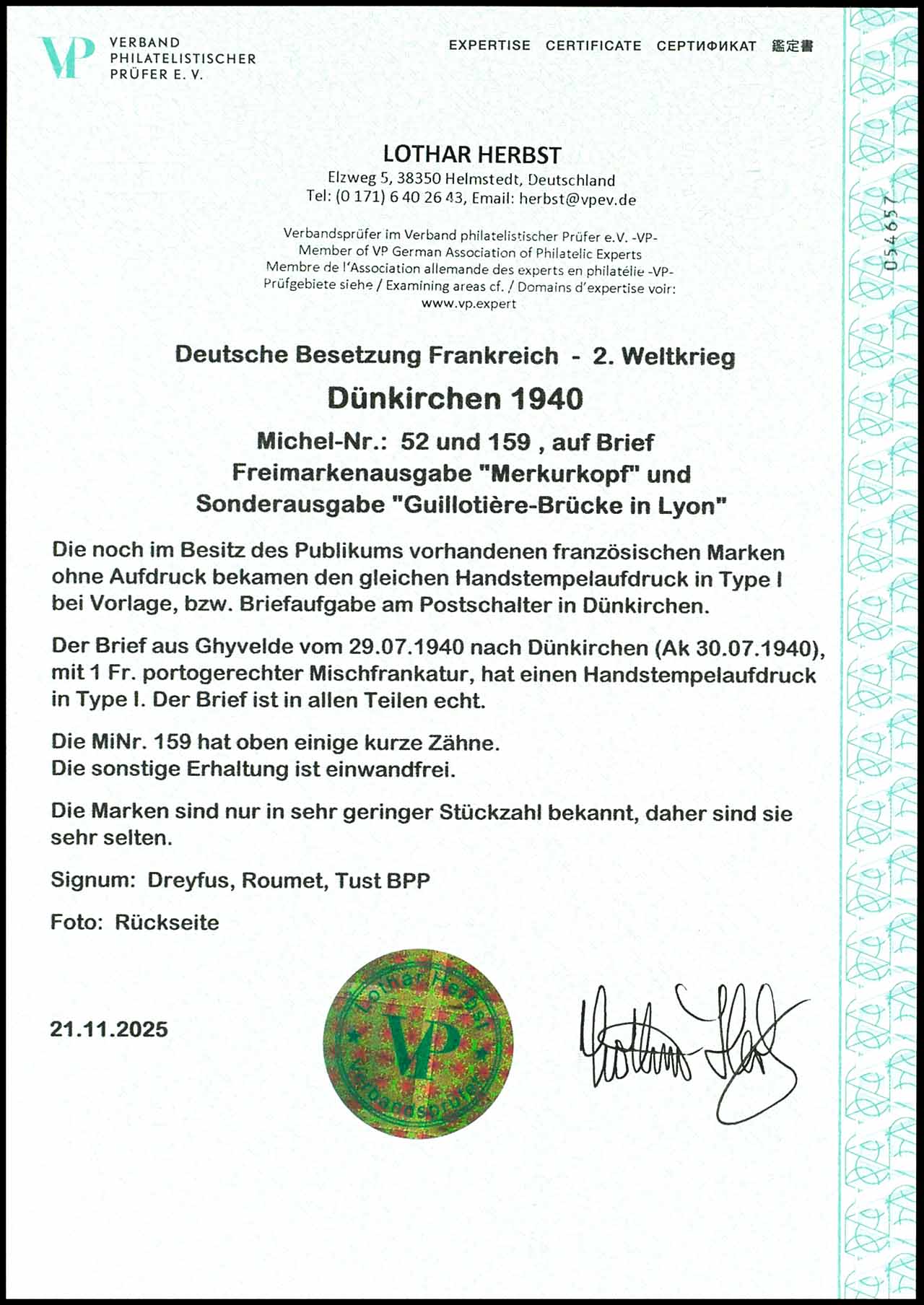 10 C. Freimarkenausgabe "Merkurkopf" und 90 C. Sonderausgabe "Guillotiere-Brücke in Lyon" mit Handstempel-Aufdruck "Besetztes Gebiet Nordfrankreich" in Type I, portogerechte Mischfrankatur auf Brief von Ghyvelde 29.07.1940 nach Dunkerque mit rückseitigem Ankunftsstempel vom 30.07.1940, Mi.-Nr. 159 oben einige kurze Zähne, Expertise Lothar Herbst VP (2023) "Die sonstige Erhaltung ist einwandfrei. Die Marken sind nur in sehr geringer Stückzahl bekannt, daher sind sie sehr selten.", Mi. 700.-