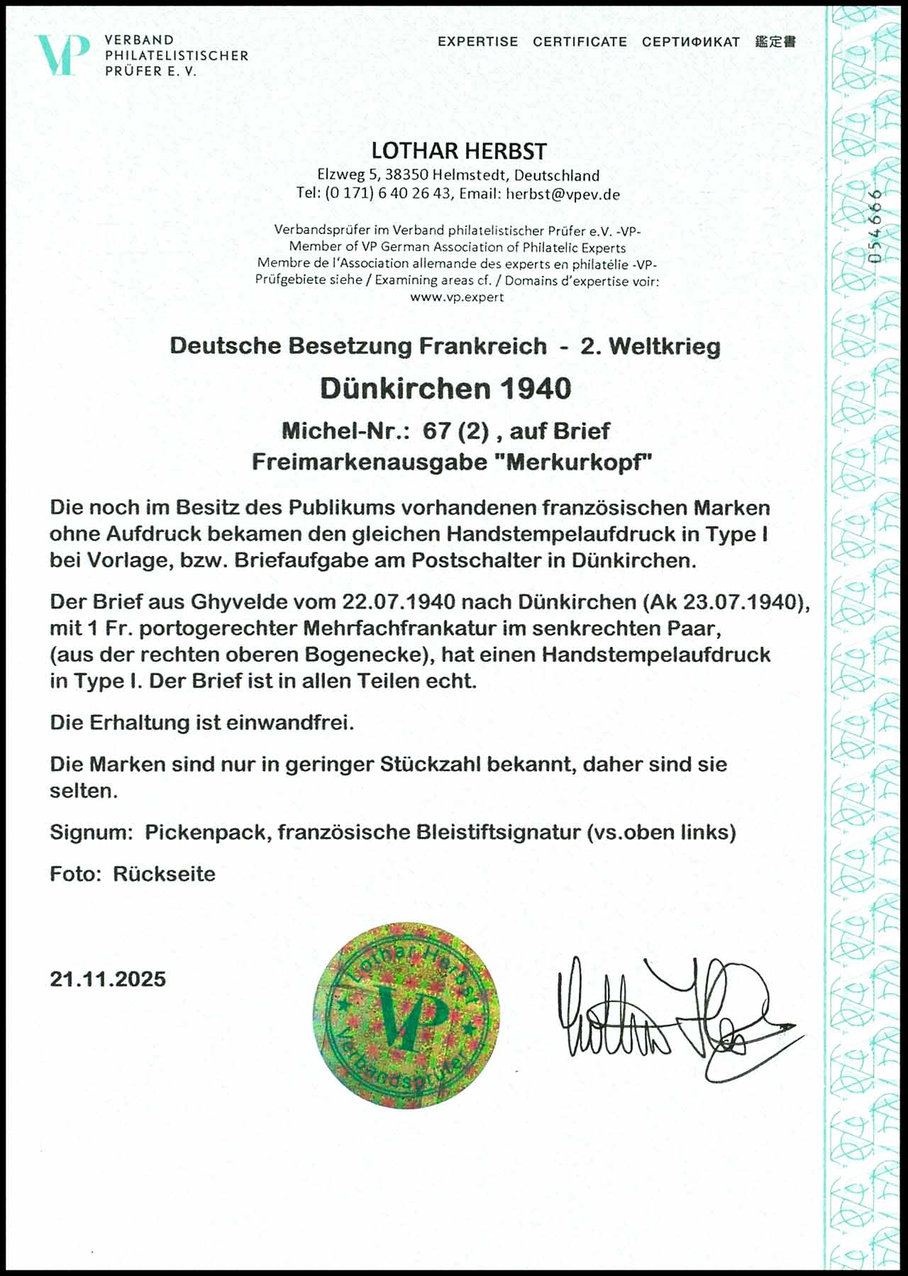 50 C. Merkurkopf, senkrechtes Paar vom linken Bogenrand mit Aufdruck "Besetztes Gebiet Nordfrankreich" in Type I, portogerechte Mehrfachfrankatur auf Brief von "Ghyvelde 22.07.1940" nach Dunkerque mit rückseitigem Ankunftsstempel vom 23.07.1940, tadellose Erhaltung, geprüft Pickenpack, Expertise Lothar Herbst VP (2025) "Die Erhaltung ist einwandfrei. Die Marken sind nur in geringer Stückzahl bekannt, daher sind sie selten.", Mi. 600.-