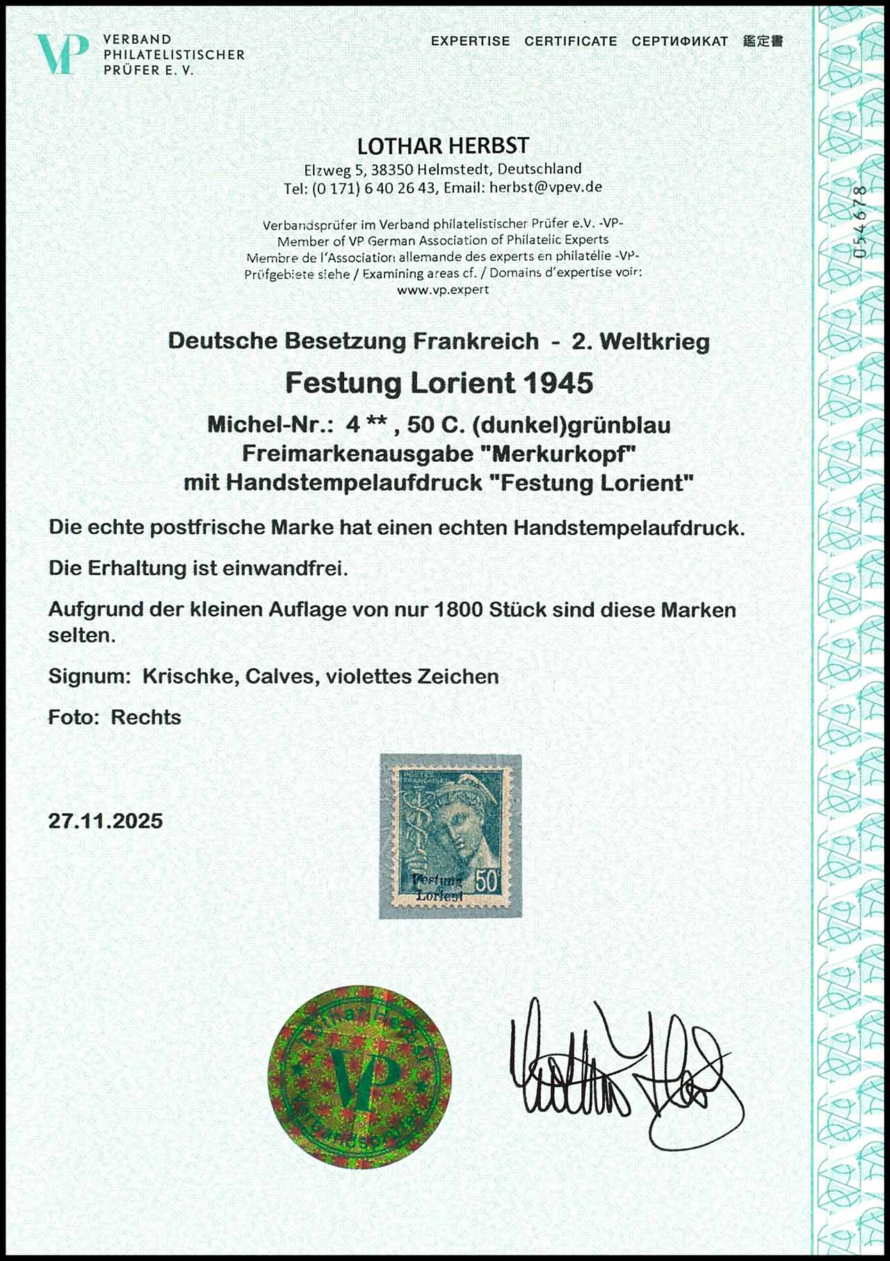 50 C. Freimarke hellblau mit Aufdruck "Festung Lorient", tadellos postfrisch, Auflage nur 1.800 Stück, geprüft Krischke, Calves und Expertise Lothar Herbst VP (2025) "Die Erhaltung ist einwandfrei."