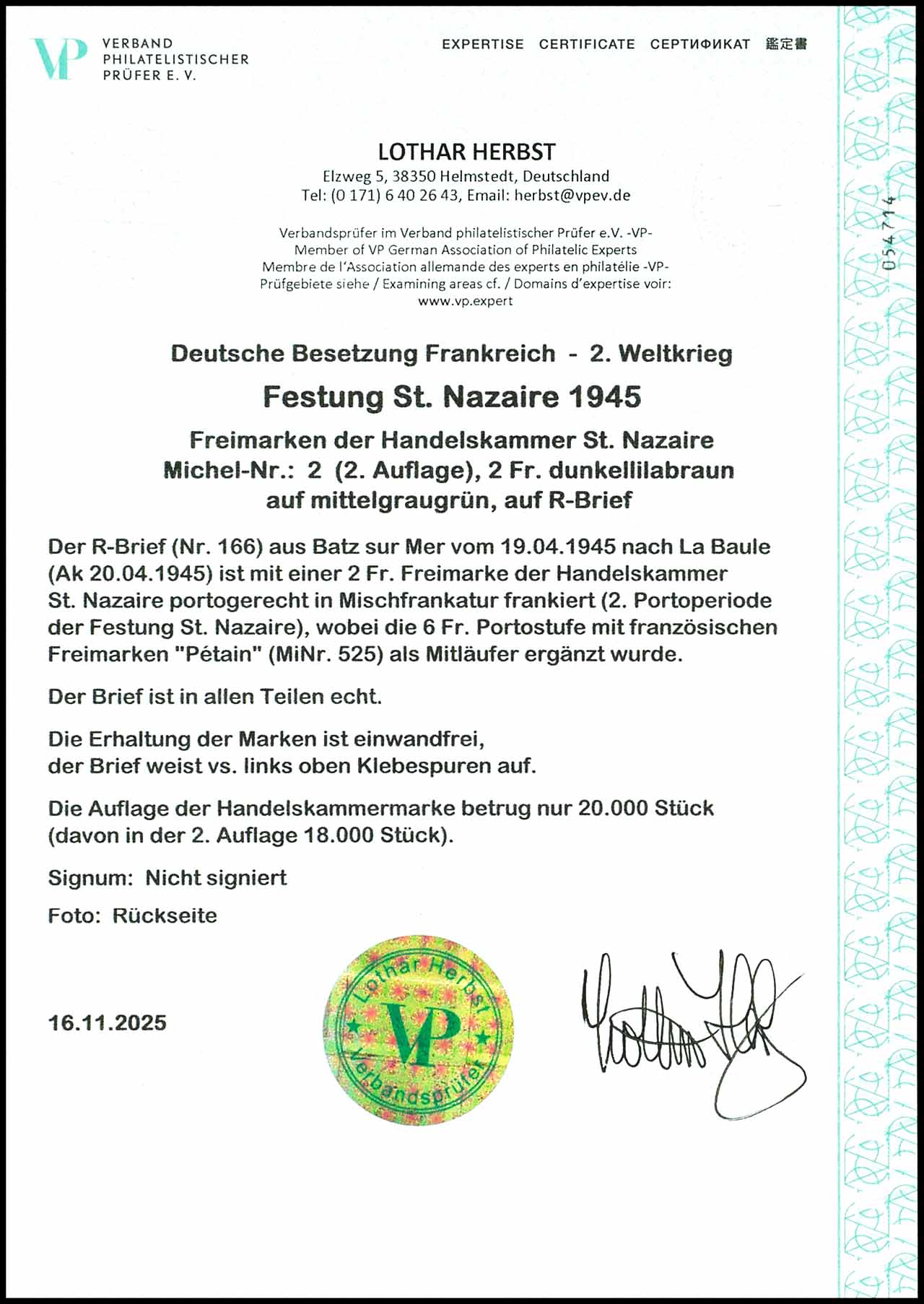 2 Fr. Handelskammermarke in Mischfrankatur mit 2 Fr. Petain (2) als portogerechte Frankatur auf R-Brief aus Batz sur Mer 19.04.45 nach La Baule mit rückseitigem Ankunftsstempel vom 20.04.45, vorderseitig links oben weist der Umschlag Klebespuren auf, Expertise Lothar Herbst VP (2025)