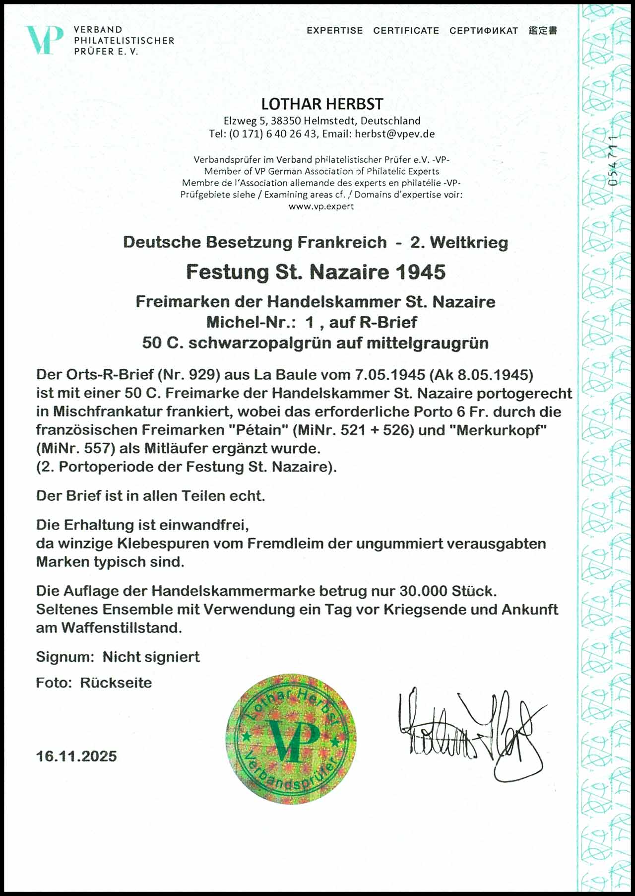 50 C. Handelskammermarke, um französische Freimarken für das 6 Fr. Porto ergänzte Mischfrankatur auf Orts-R-Brief von "La Baule 7.5.45" mit rückseitigem Ankunftsstempel vom 8.05.1945, Expertise Lothar Herbst VP (2025) "Die Erhaltung ist einwandfrei. Seltenes Ensemble mit Verwendung ein Tag vor Kriegsende und Ankunft am Waffenstillstand"