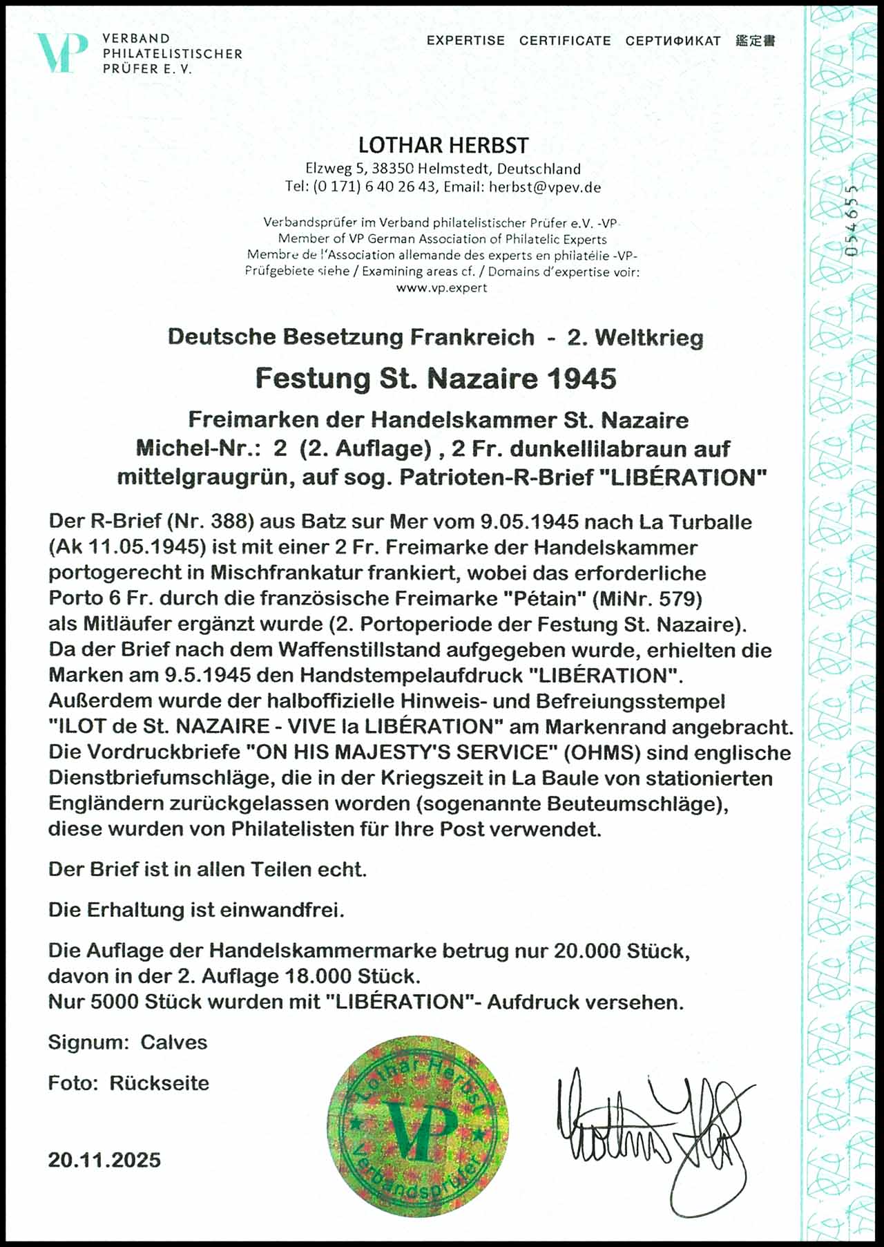 2 Fr. Handelskammermarke mit Aufdruck "Liberation" in Mischfrankatur mit 4 Fr. Petain mit gleichem Aufdruck auf R-Brief von "Batz sur Mer 9.5.45" nach La Turballe mit rückseitigem Ankunftsstempel vom 11.05.1945, aufgrund der Briefaufgabe nach dem Waffenstillstand erfolgte der Aufdruck "LIBERATION" auf den Marken, Expertise Lothar Herbst VP (2025) "Die Erhaltung ist einwandfrei."