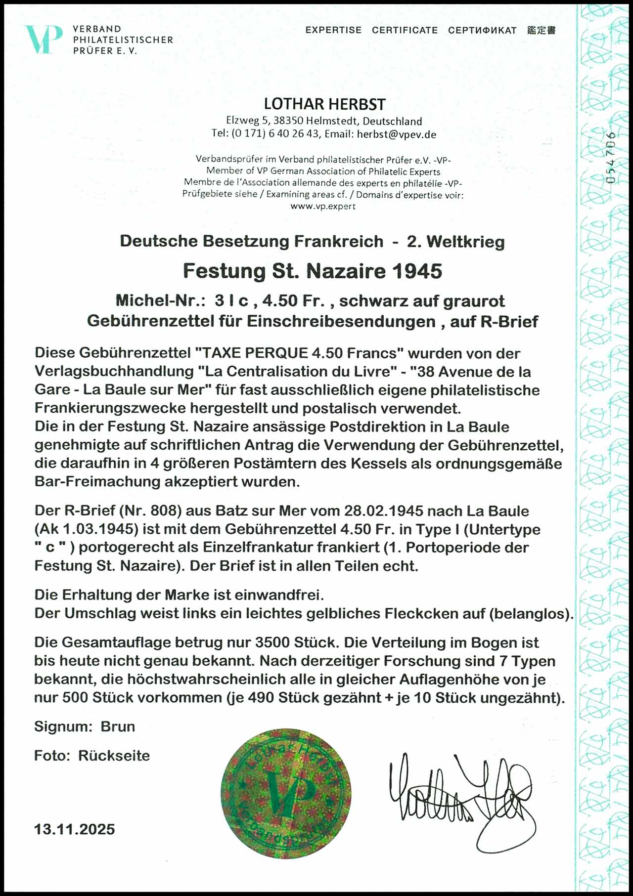 4,50 Fr. Einschreibgebührenzettel, Type Ic, Einzelfrankatur auf R-Brief von "Batz sur Mer 28 2 45" nach La Baule mit rückseitigem Ankunftsstempel vom 1.03.1945, Auflage je Type nur ca. 500 Exemplare, Expertise Lothar Herbst VP (2025) "Die Erhaltung der Marke ist einwandfrei. Der Umschlag weist links ein leichtes gelbliches Fleckchen auf (belanglos)."